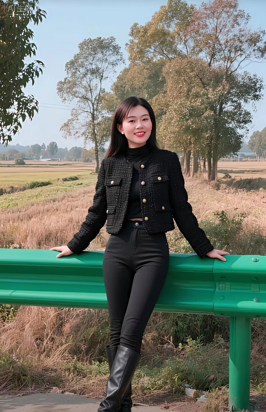 黑色皮衣搭配牛仔裤,自信微笑,尽显青春活力!