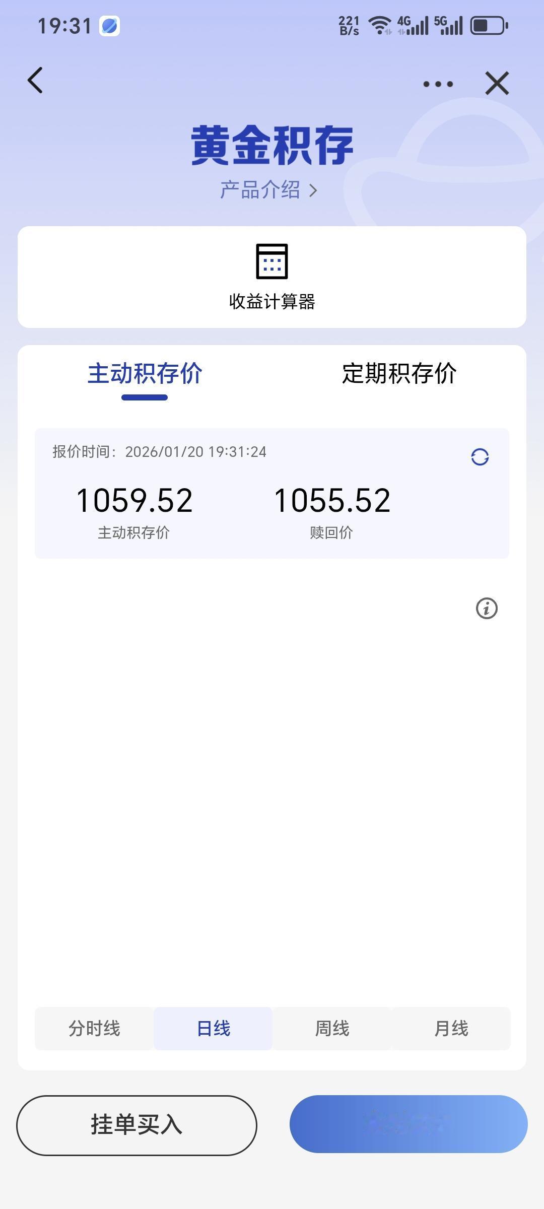 今天,21.20现在黄金仍然在上涨中。不按套路出牌了。建设银行积存金今天上午猛到1058,此刻1064了。照前几个月的规律,周一汹涌,周二周三会横盘,周五会跌一些。 真没想到黄金这两天涨这么多。如果有100万在里面,这两天真收获多多。 有些等着上车的同志们,可能焦虑了。今天会稍跌到1055么?