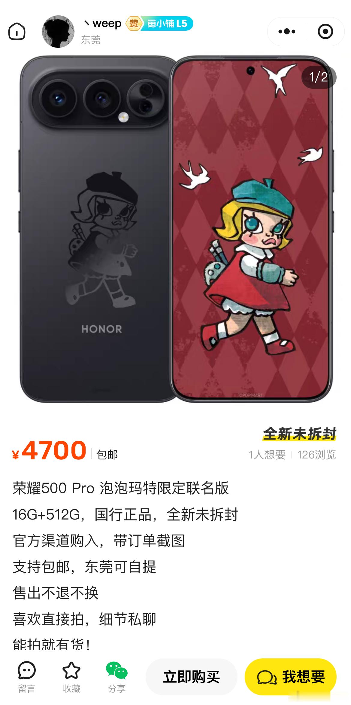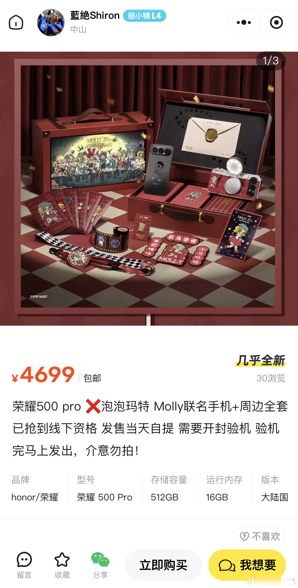 荣耀 MOLLY 联名款,是年度现象级的收藏级单品,目前二手平台已出现理性溢价售卖,自发形成的交易热度印证了此产品的跨界收藏潜力。1月25日10:08的首销时间,准时参与抢购。荣耀500泡泡玛特MOLLY