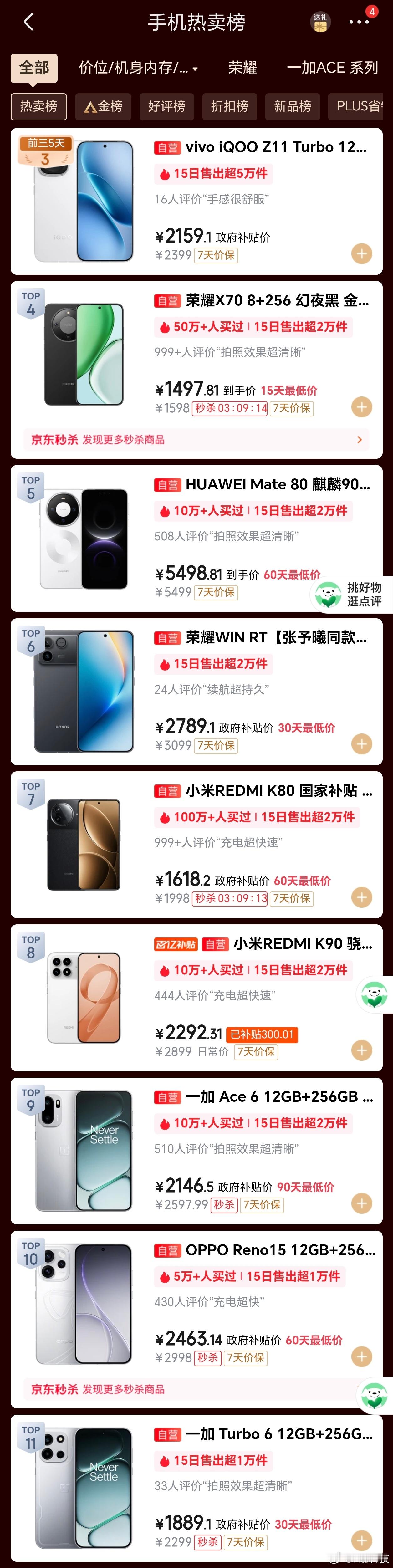 最近新品京东的表现:iQOO Z11Turbo卖得挺好,热卖榜第三,荣耀WIN RT热卖榜第六,一加Ace6热卖榜第九,一加Turbo6热卖榜第11,补一句,荣耀WIN系列的续航是实打实的。