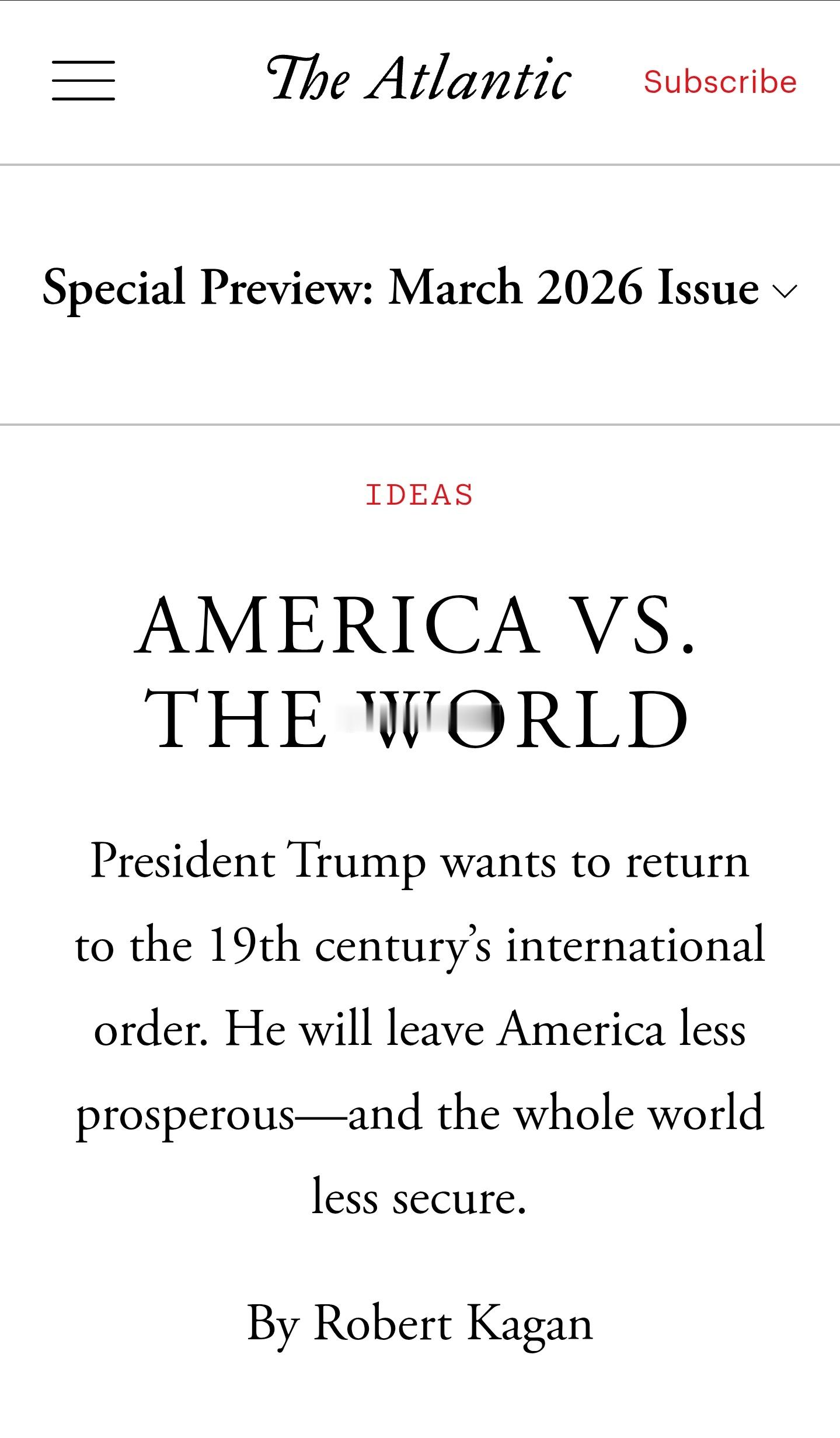 大西洋月刊最新刊登的长文:“美国对抗世界” 称,美式主导的自由主义世界秩序已经终结。这并非因为美国在物质上无法维持这一秩序,而是因为美国已经决定,不再愿意继续扮演那个史无前例、为全球提供安全保障的角色。维系过去80年世界秩序的美国力量,如今将被用于摧毁这个秩序。美国人正步入自二战以来最危险的世界,一个将让冷战看起来像小孩子过家家、让冷战后时代宛如天堂的世界。事实上,这个新世界将更像1945年前的世界,充满多个大国以及不断升级的竞争与冲突。美国将不再拥有可靠的朋友或盟友,必须完全依靠自身力量来生存与繁荣。这将需要增加军费支出,而不是削减,因为美国人长期享有的海外资源、市场和战略基地的自由准入,将不再是同盟带来的附属利益,而是必须与其他大国竞争并加以捍卫的对象。这就是美国正自愿走入的新时代,一个失去了最大优势的世界。美中之间最重要的差距,并不在于军事或经济力量, 而是美国所建立的全球同盟与伙伴体系。但若美国不再保障他们的安全,反而对他们发动经济战争,并提出他们无法接受的政治和意识形态要求,他们很可能重新考量与美关系。如果美国人曾认为捍卫自由主义世界秩序代价太高,那他们很快就会意识到,即将付出的代价要更沉重得多。海外新鲜事