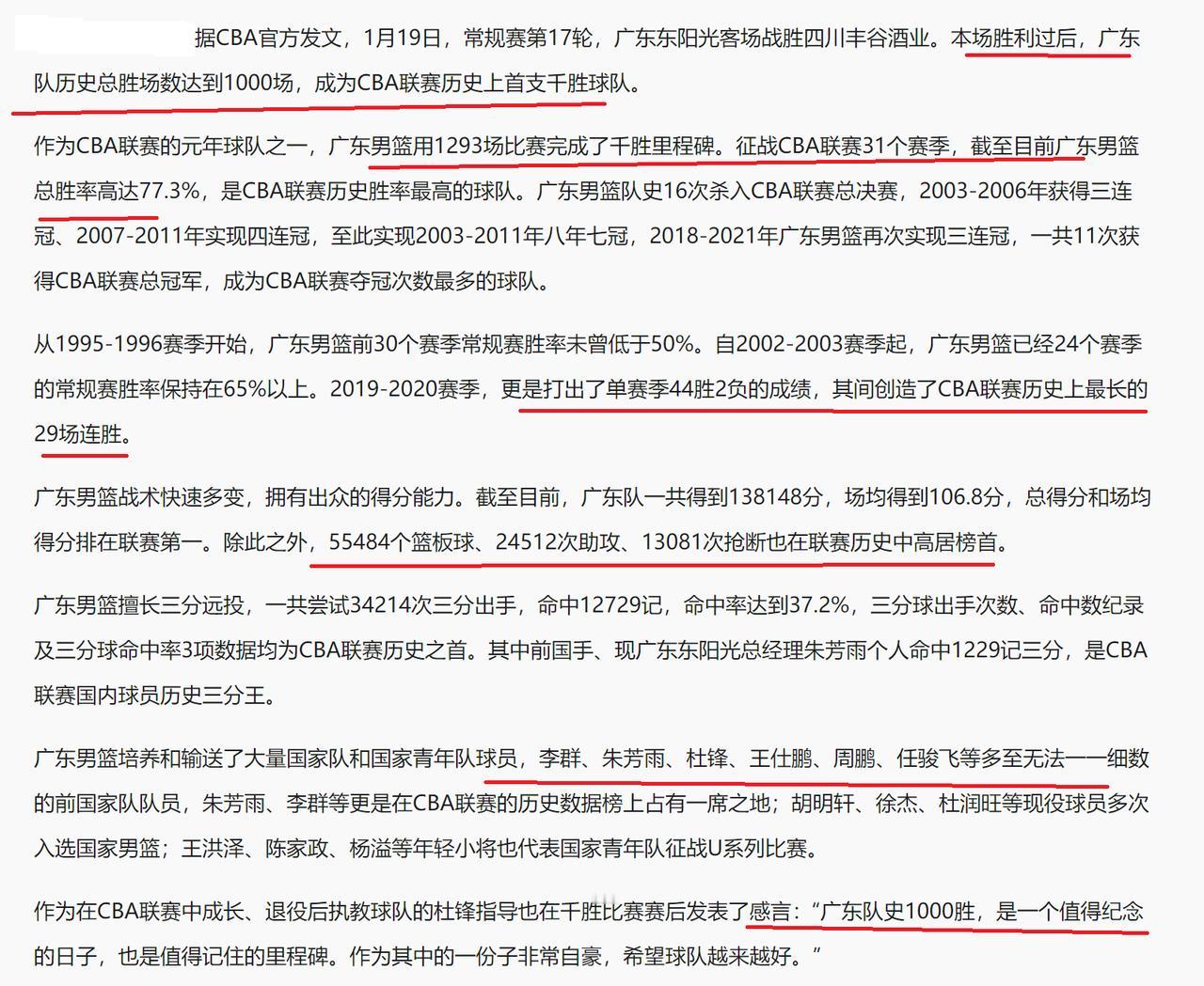 CBA公司发文祝贺广东队! 昨晚,广东队与四川队的比赛,最终,广东队展现出来了更胜一筹的实力,最终,以28分的巨大优势击败了四川队。如此一来,广东队以13胜4负的成绩,继续排在CBA积分榜第二名。当然了,四川队则十分尴尬,至今没有拿到一场比赛胜利,遭到了17连败。 值得一提的是,随着广东队拿下本场比赛胜利,也是拿到了在CBA联赛的第1000胜,成为了CBA联赛第一支拿到1000胜的球队。至今,广东队在CBA联赛打了1293场球,取得了1000场比赛胜利,胜率达到了77.3%,这样的比赛胜率,在CBA联赛也是独树一帜。 随着广东队拿到了队史第1000胜利,也是收到了很多祝福!广东队也是在第一时间,发布了这个好消息,并且,还制作了1000胜的海报。显然,广东队拿到CBA联赛第1000胜,不管是对CBA联赛,还是对广东队而言,都在具备里程碑的意义! 随着广东队取得队史1000胜,CBA公司也是在第一时间发文祝贺广东队!恭喜广东队成为CBA联赛历史上首支千胜球队。 与此同时,CBA公司还细数了广东队很多光荣的历史纪录,在此,我们就来看看,广东队有哪些惊人的纪录: 1、CBA首支达到1000胜的球队。 2、队史16次杀入CBA联赛总决赛,排在CBA联赛第一位。 3、CBA联赛历史胜率最高的球队,胜率达到了77.3%。 4、CBA夺冠最多的球队,11次获得CBA总冠军。 5、CBA联赛历史上最长的连胜,在2019-2020赛季,广东队达到了29场连胜。 6、至今,广东队在CBA联赛一共得了138148分,场均得分为106.8分,不管是总得分,还是场均得分,都是排在CBA联赛第一名。 7、至今,广东队摘下了55484个篮板球,排在CBA第一。 8、至今,广东队一共送出24512次助攻,排在CBA第一。 9、至今,广东队一共有13081次抢断,排在CBA第一。 10、至今,广东队投进了12729记三分球,排在CBA第一。 11、CBA创办至今,广东队从来没有缺席过CBA季后赛,独此一家。 12、半场得98分,CBA第一。 …… 广东队还有很多CBA第一,在此,就不一一说明了!