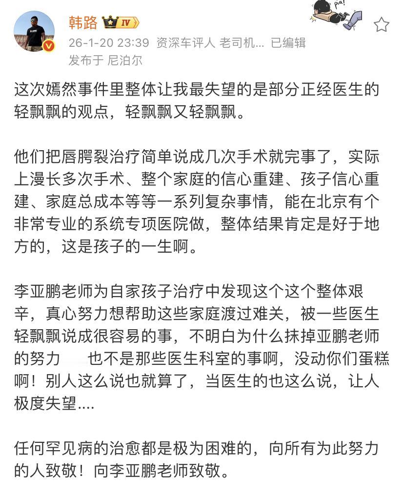 韩路:这次嫣然事件里整体让我最失望的是部分正经医生的轻飘飘的观点,轻飘飘又轻飘飘