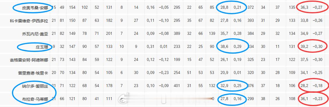 截止目前圣乔万尼的四个主攻的数据对比一目了然,蓝圈是一传到位率和效率,红圈是进攻成功率和效率。名字是机器翻译的。就是说庄宇珊 入队后,对球队的保障环节起到了重要作用,这样好一传情况下,队内副攻和弱接应的进攻分担作用就发挥出来了,才能多点开花,同时庄的进攻也能分担不少,这样球队就进入了一个流畅的状态。庄宇珊意大利女排联赛