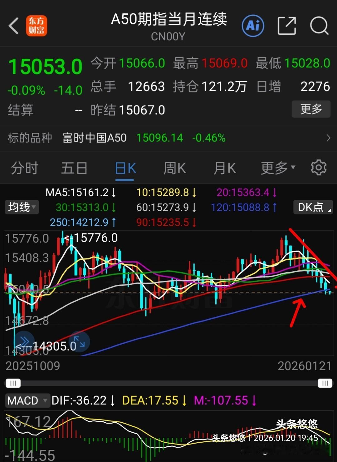 它就是A股及港股走势风向标,一个外国机构采用中国A股制定的指数---A50期指!它的走势往往影响着A股及港股特别是恒生科技指数走势。它全天连续交易,利空利好消息都能提前反应,根据过往经验,只要它大涨,恒生科技及A股大盘就不会跌,反之,它要是跳水,港股及A股一定跟随下跌。 看看它近期走势如下图所示,已经连续下跌12天,并且8连阴,所以恒生科技最近几天也是连续下跌,A股大盘也是连续下跌,难道是巧合吗?所以,关注A50期指走势,预测恒生科技及A股大盘涨跌,概率比较大(没有必然性)。