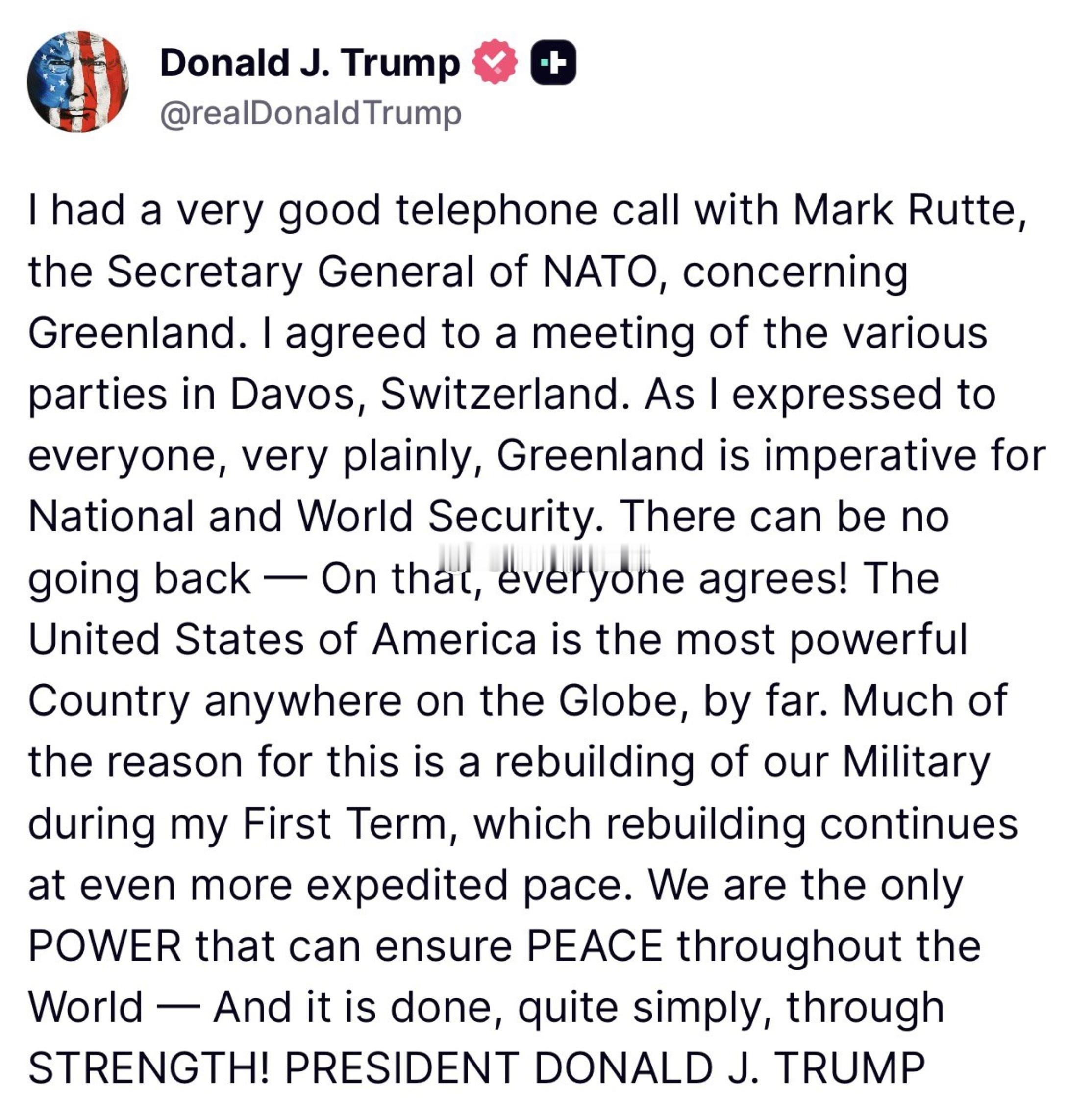 特朗普:我与北约秘书长马克·吕特就格陵兰岛问题进行了非常好的电话交谈。我同意各方在瑞士达沃斯举行会议。正如我向所有人明确表达的那样,格陵兰岛对国家和世界安全至关重要。没有回头路——这一点,大家都同意!美利坚合众国是全球最强大的国家,遥遥领先。这很大程度上归功于我第一任期内对军队的重建,而这一重建工作仍在以更快的速度继续进行。我们是唯一能够确保世界和平的力量——而实现和平的方式很简单,就是依靠实力!海外新鲜事