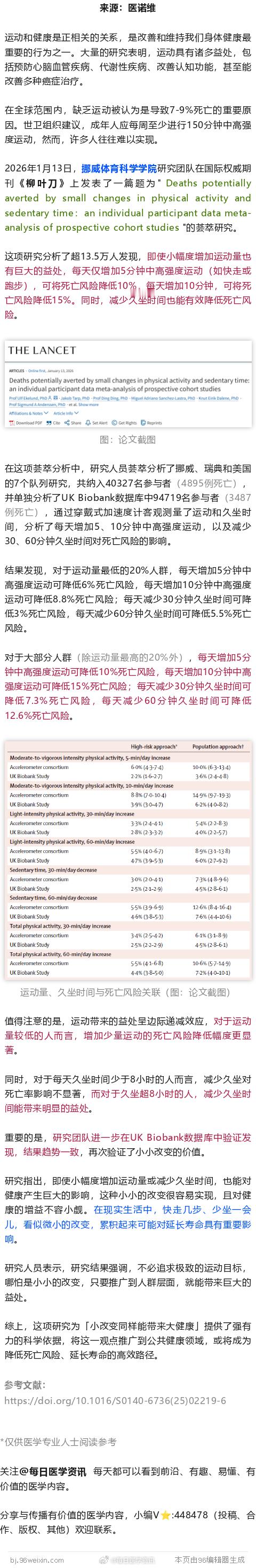 小小改变也能延寿!《柳叶刀》重磅:每天仅增加5分钟运动,就能显著延长寿命2026年1月13日,挪威体育科学学院研究团队在国际权威期刊《柳叶刀》上发表了一篇题为" Deaths potentially averted by small changes in physical activity and sedentary time:an individual participant data meta-analysis of prospective cohort studies "的荟萃研究。这项研究分析了超13.5万人发现,即使小幅度增加运动量也有巨大的益处,每天仅增加5分钟中高强度运动(如快走或跑步),可将死亡风险降低10%,每天增加10分钟,可将死亡风险降低15%。同时,减少久坐时间也能有效降低死亡风险。