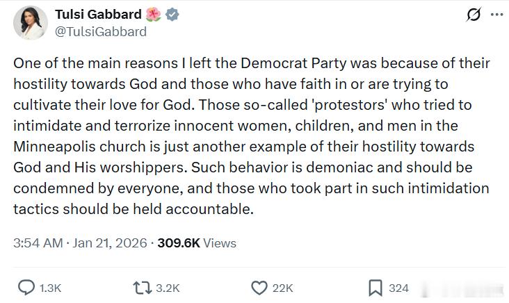 美国情报总监图尔西·加巴德:我退出民左党的主要原因之一,就是因为他们对上蒂以及那些有信仰、或正在努力培养对上蒂之爱的人的敌意。那些所谓的“坑议者”,试图恐吓和威胁明尼阿波利斯教堂里的无辜妇女、儿童和男子,就是他们敌视上蒂及其敬拜者的又一例证。这种行为简直就是魔鬼作祟,应该受到所有人的谴责,而参与这种恐吓行为的人应当承担责任。
