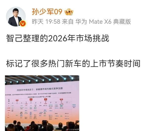 惊不惊喜!“智己整理的2026年市场挑战 标记了很多热门新车的上市节奏时间。” 原来“鸿蒙智行五界聚首”时,张总所说,“SUV绝对是不一样,MPV也绝对不一样。” 享界E SUV,预计3月份上市;享界MPV 9月份上市,看来,鸿蒙智行2026年要满足不同市场需要和不同风格了! #晒图笔记大赛#
