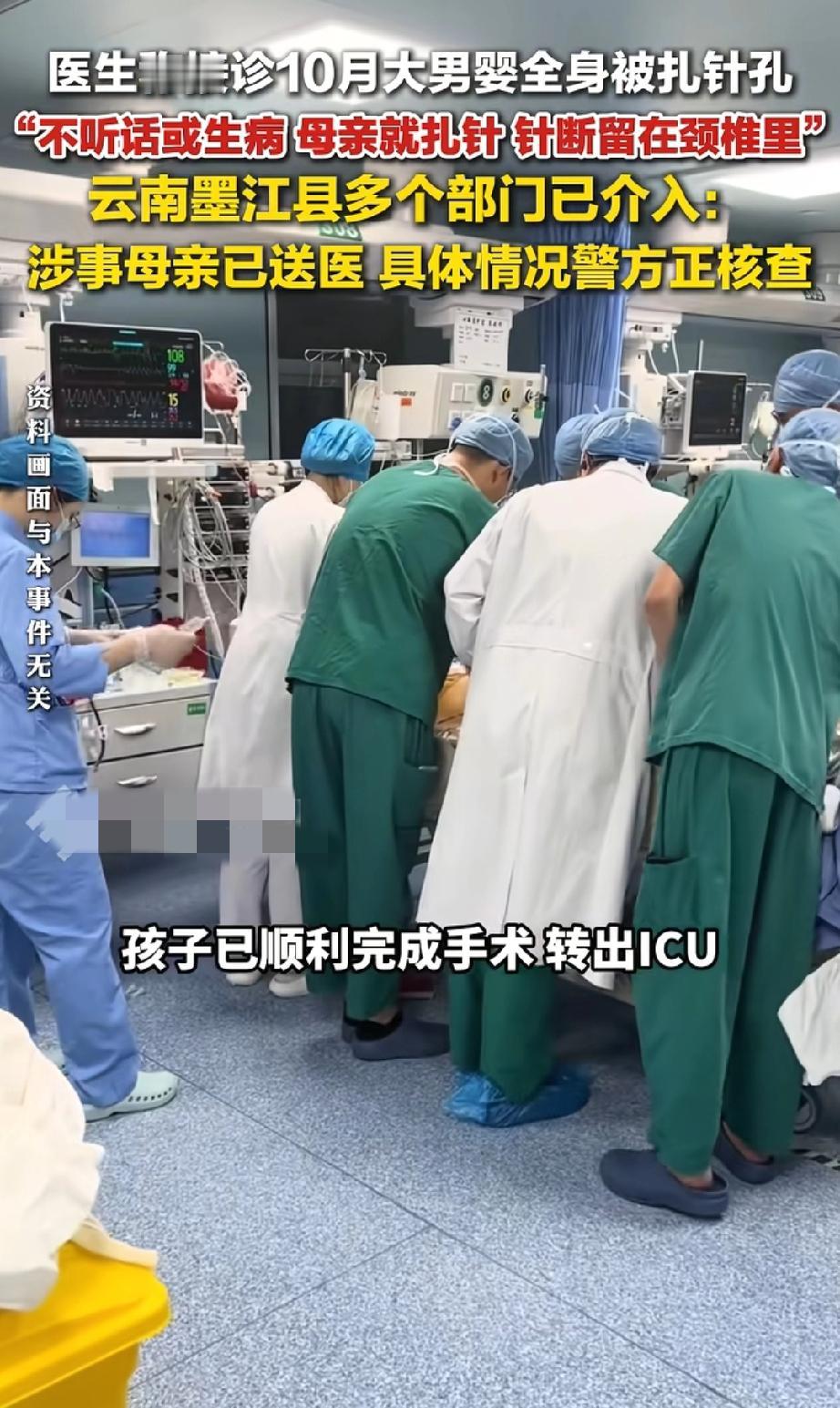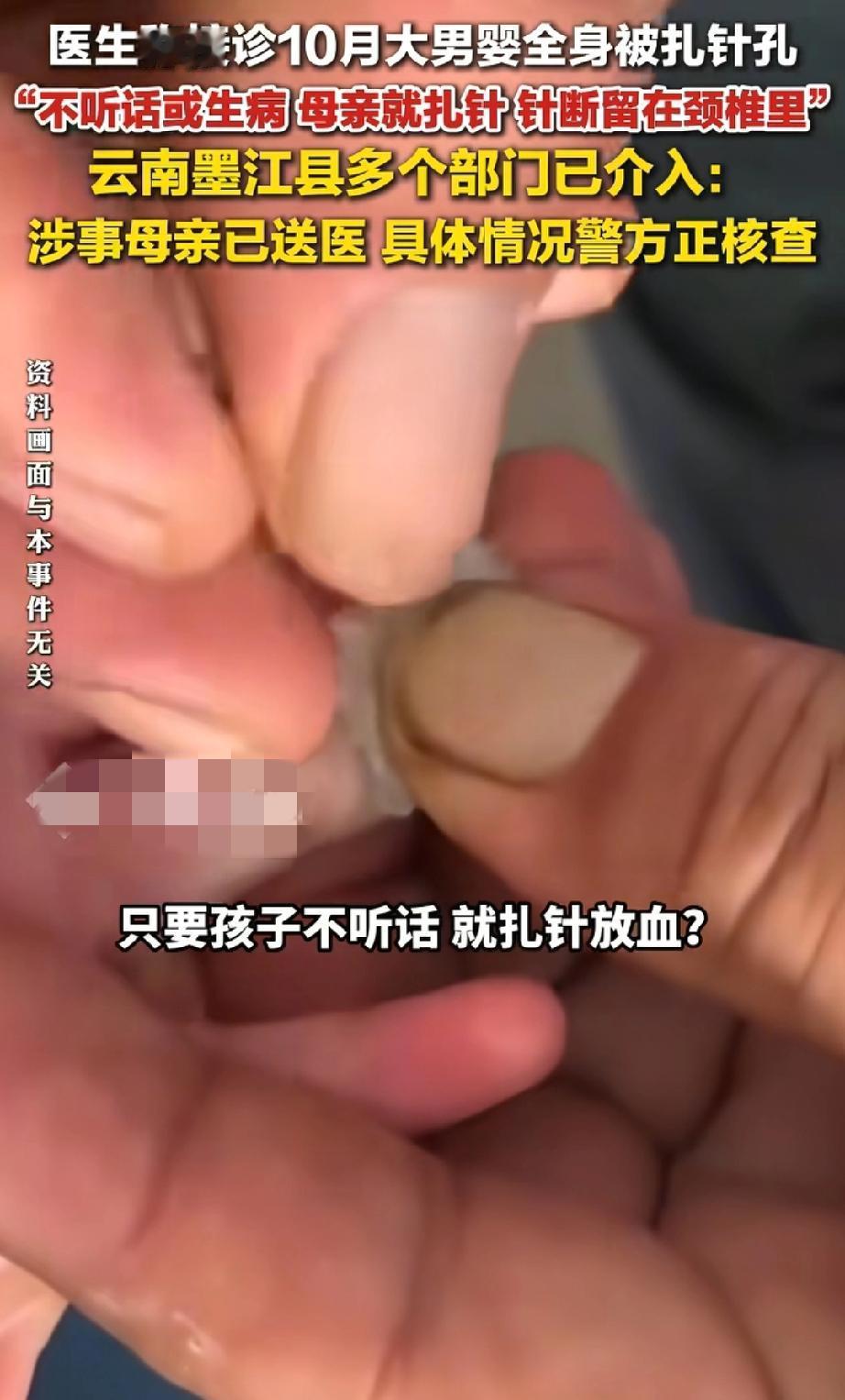 只要孩子不听话就扎针放血? 云南墨江一名10个月大的宝宝,被医生接诊时发现浑身布满针孔,更让人揪心的是,一根针直接断在他的颈椎里! 据医生透露,孩子的母亲长期用针扎孩子,理由更让人愤怒:只要孩子“不听话”或者“生病”,她就用针扎孩子“放血”。 这当妈真是恶魔,太狠了!这么小的宝宝,连话都不会说,疼得只能撕心裂肺地哭,想想就可怜!