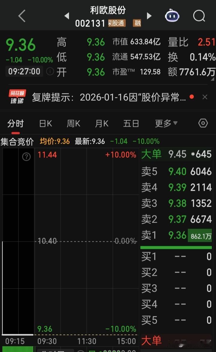 【年内首只跌停巨大封单】 开盘就是962万手的跌停封单 开盘6分钟就达到1018万手封单 猜猜,收盘封单会多少?会几板?