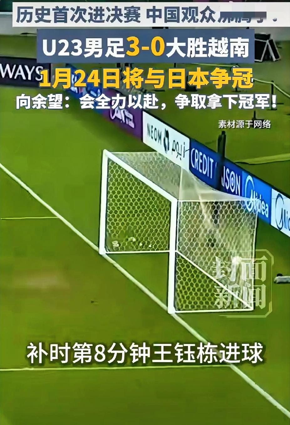 破防了!中国男足等22年终进决赛,3-0赢越南[祝福][祝福] 谁懂啊家人们!中国男足U23这波操作直接把人看哭!3-0干净利落拿下越南,昂首挺进U23亚洲杯决赛,这可是男足各级国字号时隔22年再闯洲际赛事决赛,上一次还是2004年的记忆呢! 以前看国足总被调侃“踢得稀碎”,这次的小伙子们是真争气!不光赢球还零失球,从小组赛到半决赛一球未丢,连越南球迷都服了,直言“中国足球就是比我们强” 。更有意思的是,日本球迷已经开始紧张了,担心“先丢球就难打了”,还特意研究咱们的门神李昊,这排面不得给小伙子们点个赞! 向余望说踢日本队没包袱,这话太提气了!反正已经创造历史,不如放开了拼,毕竟“光脚不怕穿鞋的”。22年的等待不是白费的,青训的果子终于开始结果,这股拼劲才是中国足球该有的样子! 决赛对阵日本,你觉得小伙子们能再创奇迹吗?是看好钢铁防线守住胜利,还是期待反击绝杀?评论区聊聊你的预测,一起为U23国足加油,见证中国足球的新起点!中国男足U23时隔22年再进决赛