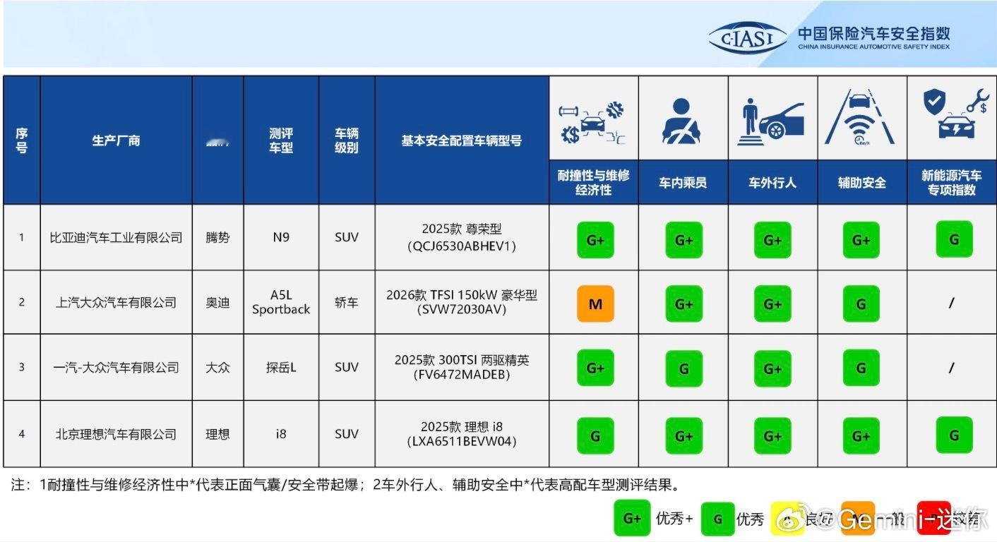 中保研公布的新一批测试车型成绩,腾势N9拿下4个G+和1个G的评价,全场最佳,安全性拉满腾势n9汽车资讯大v聊车