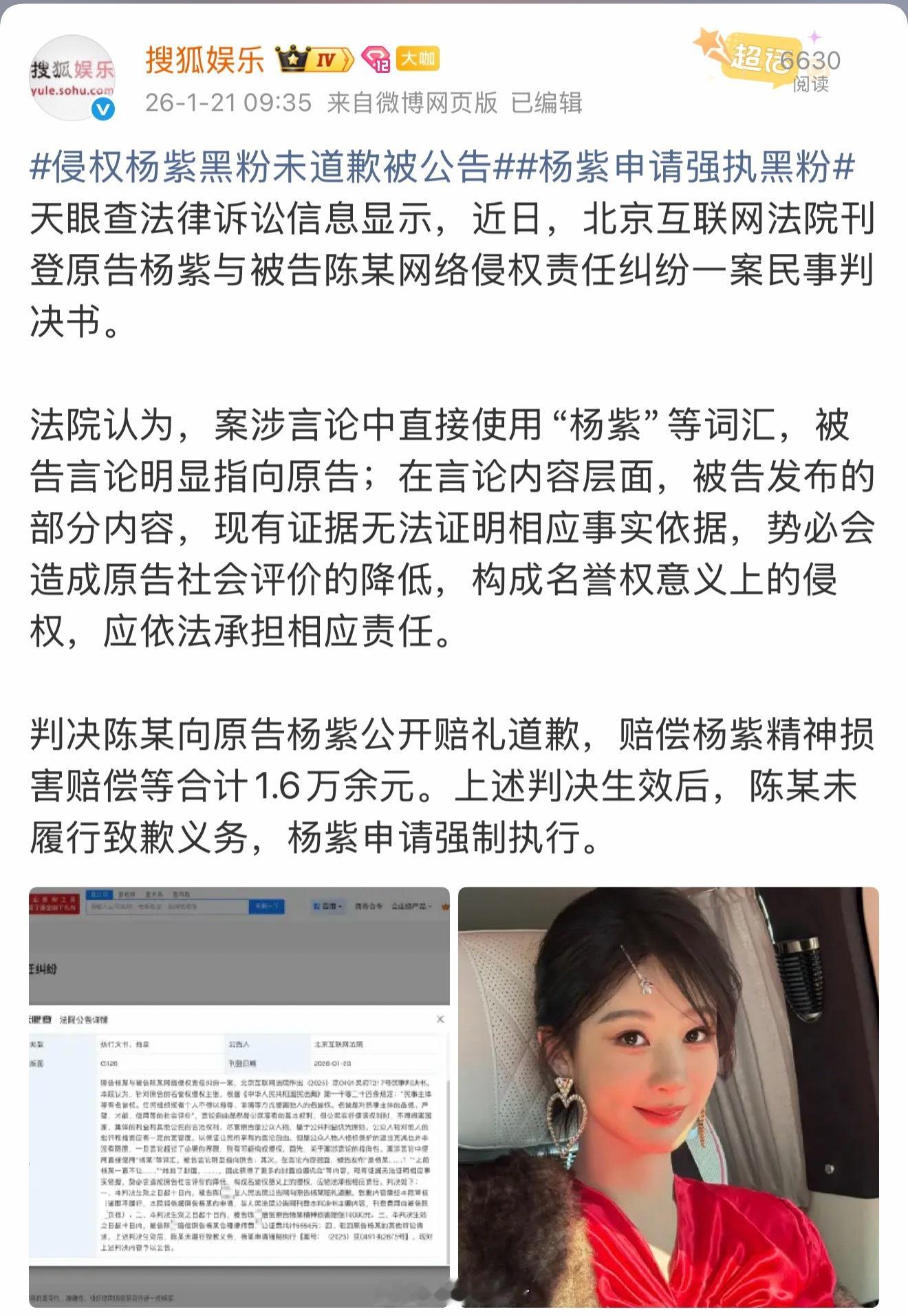 维权成功后对方拒不履行道歉判决,杨紫申请强制执行。在网上攻击别人时很嚣张,却不敢承担后果,真好笑,支持杨紫捍卫自己的合法权益。