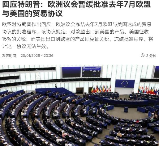 欧洲终于对美国硬了一回!欧洲对美国进行反击!1月21日,根据法新社报道,鉴于美国以加税威胁欧洲在格陵兰岛问题上让步,欧洲正式对美国进行回击。欧洲议会冻结了去年7月欧盟与美国达成的贸易协议的批准程序。欧洲启动这一冻结程序意味着什么呢?这意味着欧洲与美国谈定的关税条款,将不会生效。   事情的起因很明确,美国又拿关税当武器,逼着欧洲在格陵兰岛问题上让步。1月17日,美国总统特朗普在社交平台发声,宣布从2月1日起对丹麦、挪威、瑞典等八个欧洲国家的输美商品加征10%关税。   特朗普还放话,今年6月起税率会进一步提升至25%,施压手段直白又强硬,目的就是逼相关各方同意美国“全面、彻底购买格陵兰岛”的无理要求。   格陵兰岛作为丹麦的自治领地,其归属与未来本就该由丹麦和格陵兰岛人民自主决定,美国这番觊觎与胁迫,彻底触碰了欧洲的底线。   丹麦率先硬气表态,不仅拒绝向美国的关税威胁妥协,丹麦议员佩勒·德拉格斯泰德更是直接发文喊出“受够了”,敦促欧洲各国团结一致对抗这种霸凌手段。   丹麦商会首席执行官布莱恩·米克尔森也公开驳斥美方威胁,直言这种做法既损伤世界贸易信心,又会对欧美双方经济造成实质伤害,闹剧不该再继续。   欧盟各国领导人也迅速形成统一战线,法国总统马克龙明确表示关税威胁不可接受且不合时宜,强调若威胁成真,欧洲会以团结协调的姿态反击,绝不被恐吓动摇。   瑞典首相克里斯特松更是态度坚决,直言欧洲绝不允许被勒索,只有丹麦和格陵兰岛能决定自身事务,自己会全力捍卫国家及盟国利益。   欧盟委员会主席冯德莱恩与欧洲理事会主席科斯塔还联合发表声明,警示美方加征关税会破坏跨大西洋关系,甚至引发危险的恶性循环,欧洲会坚定维护自身主权。   在各方声讨与共识之下,欧洲议会拿出了最实际的反击手段——冻结贸易协议批准。这份去年7月达成的协议本就存在诸多博弈,条款约定欧盟取消对美国工业品关税,为美海产品和农产品提供优惠准入。   美国则对大多数欧盟输美商品征收15%关税,同时双方还就能源、芯片等领域达成部分承诺,欧盟甚至计划到2028年前采购7500亿美元美国能源产品。   如今程序被冻结,这些约定好的关税条款全部沦为空谈,美国想通过贸易协议获利的算盘彻底落空。欧洲议会最大党团欧洲人民党主席曼弗雷德·韦伯说得很明白,鉴于美方对格陵兰岛的无理威胁,现阶段绝不可能批准该协议,对美相关产品的零关税措施也必须暂停。   欧洲议会国际贸易委员会主席贝恩德·朗格更是直接呼吁启动反胁迫机制,强调美国把贸易当作政治威胁工具,已经跨过了新的红线,商业贸易不能再照常进行。   复兴欧洲党团与社会民主党党团也纷纷响应,要么建议明确启动反胁迫工具,要么直言此时批准协议不是务实而是愚蠢,若美方胁迫持续,不排除采取报复性关税。   欧洲这番操作绝非鲁莽,而是算清了利弊后的精准反击。此前美国就频繁以国家安全为由动用关税工具,此次为了觊觎格陵兰岛再度挥棒,早已让欧洲各国忍无可忍。   格陵兰岛当地民众也用行动表达不满,1月17日当天,格陵兰岛首府努克与丹麦首都哥本哈根等地均举行抗议活动,格陵兰岛自治政府总理亲自参与游行,强调“我们的未来由自己决定”。   塞尔维亚学者米特罗维奇也一针见血指出,美方觊觎格陵兰岛的行为违反国际法,破坏地区稳定,这种单边举措正在挑战国际秩序,也折射出美国霸权的衰落。   美国频繁用关税施压的做法不仅损害他国利益,更在不断削弱自身国际影响力,慢慢失去世界各国的尊重。欧洲此次冻结贸易协议,就是要让美国明白,盟友不是可以随意拿捏的棋子,胁迫手段换不来妥协。   跨大西洋关系本就因诸多分歧裂痕渐生,美国此次的霸权行径更是火上浇油。欧洲用实际行动打破了对美国的妥协惯性,也传递出一个明确信号:主权与尊严不容侵犯,任何胁迫都将遭遇强硬回击。   这份被冻结的贸易协议,成了欧洲对抗美国霸权的有力筹码,后续双方博弈还将持续,但欧洲此次硬刚已经为自己赢得了主动,也让国际社会看到了其维护自身利益的决心。   官方信源及发布时间:央视网,2026年1月18日15时36分,《美国为“夺岛”加征关税 欧洲议会议员说将搁置欧美贸易协议》