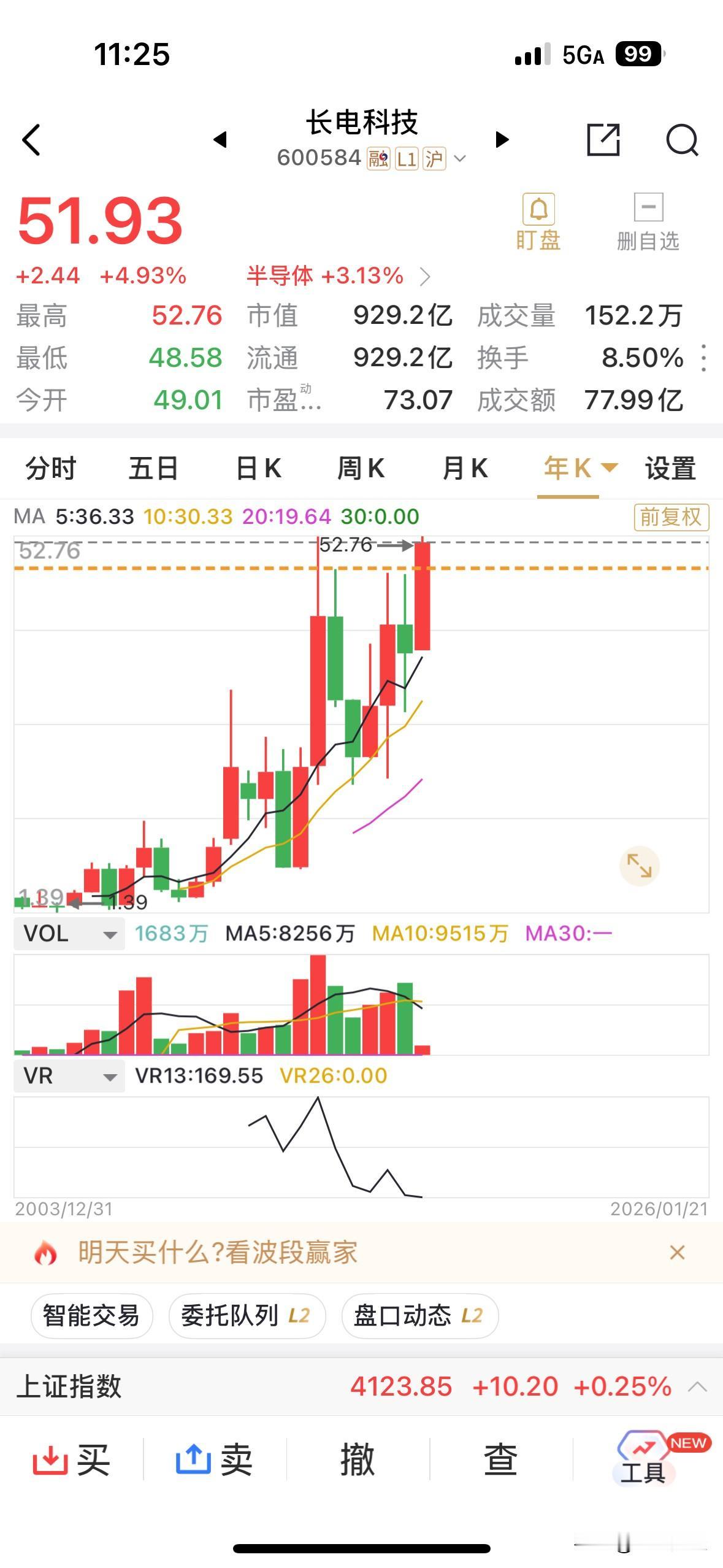 周三对长电科技而言是一个值得关注的日子,盘中创下历史新高52.76元(复权后),这下长电科技再无套牢盘,也成功的将我这坚定不移的持仓者推了出去,目前仅留200股,好继续关注长电科技在本轮封装涨价预期下,究竟能飞得多远。 短短的不到一个月时间,涨幅已经超过40%,个人己经非常满意这凌厉的走势,愿留下来的股友们继续赚得盆满钵满。 作为囯内第一大先进封装企业,个人认为长电科技还是有望冲击千亿元市值的关口的。 乐呀财经