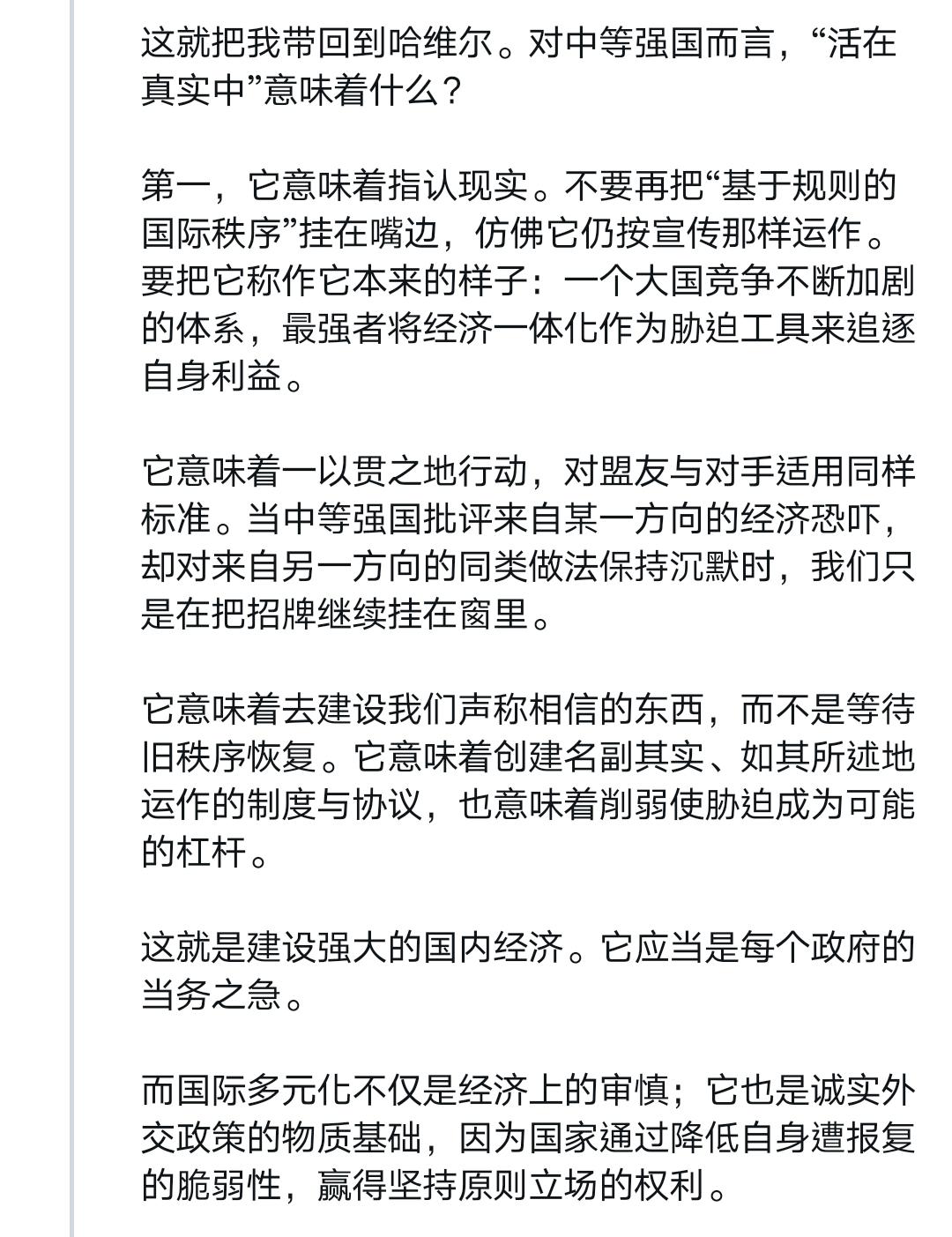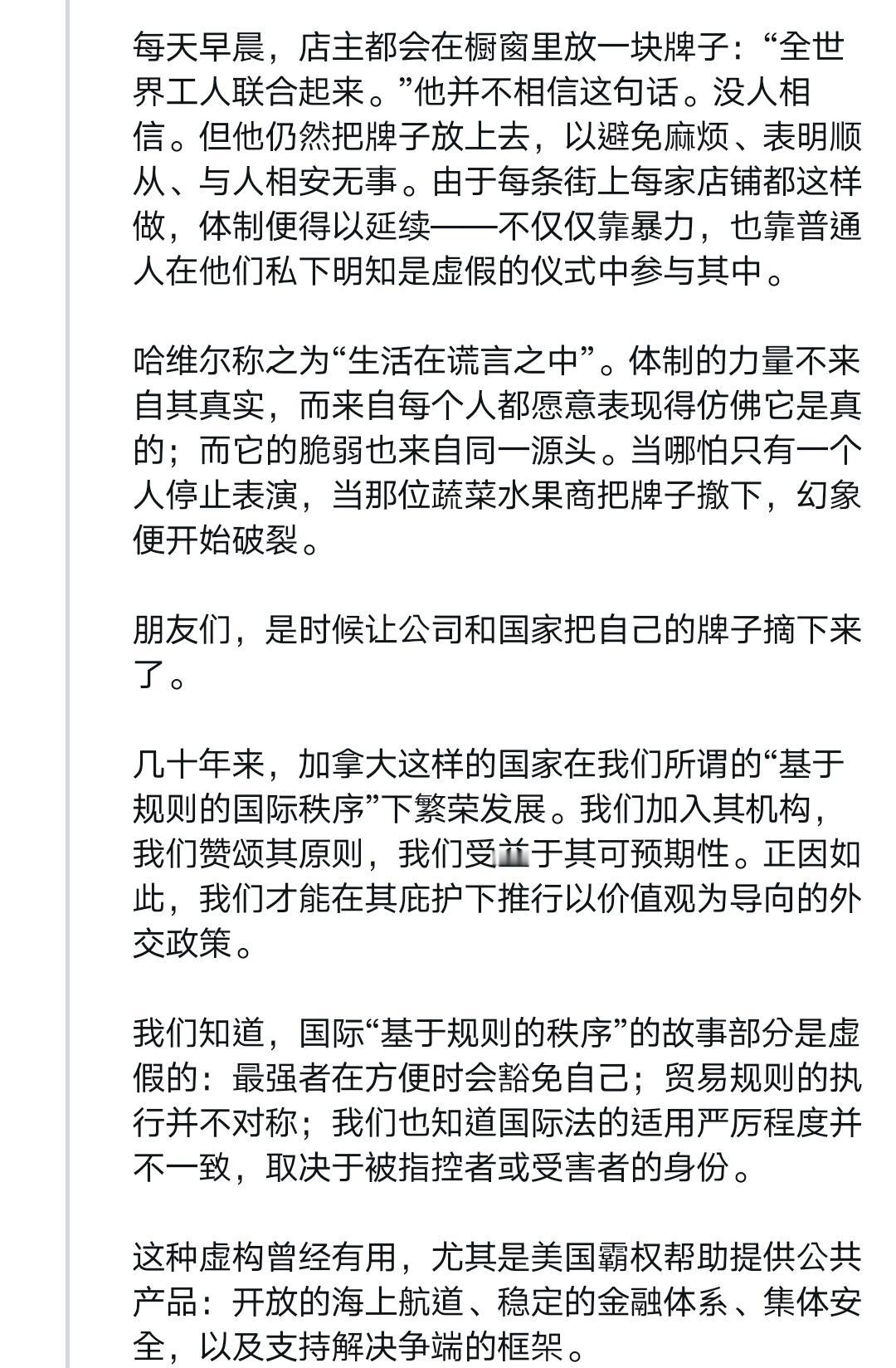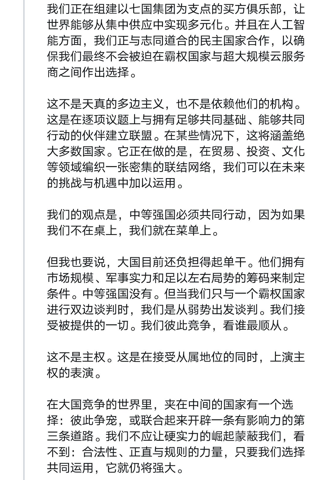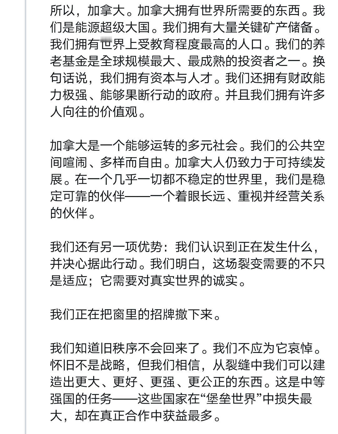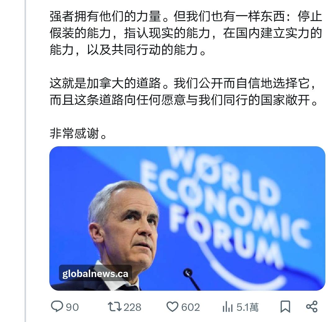 这应该是近些年来西方国家政要最深刻的反省——卡尼达沃斯演讲全文 我得说,卡尼在达沃斯的演讲是真诚、勇敢的,他说出了很多西方人不敢说出的话。 过去很长一段时间,西方多国过去拥护“基于规则的国际秩序”,本质是贪恋它带来的稳定与可预测性,认为这是长久繁荣的保障,甘愿自欺欺人维系幻象。 但这一切早已改变。旧秩序彻底断裂,美国霸权式微后,经济一体化沦为大国胁迫工具,多边机构摇摇欲坠,曾经的稳定与可预测性荡然无存。 卡尼直言不讳呼吁同侪:别再自欺欺人!他宣告加拿大要跳出幻象,秉持“基于现实主义的价值”前行——对内筑牢能源、矿产、国防硬实力,对外拓展多元合作,守住自身的稳定与主动。 作为吹哨者,他点破了西方的集体自欺。旧秩序的稳定一去不返,与其沉溺过往,不如直面现实、主动破局,这便是卡尼想传递的核心清醒。 我想摘取他演讲中的平实却极具震撼力的一段出来,应该可以作为所有以美国马首是瞻的西方国家的借鉴,他这样说道: 「所幸,我们还有另一项优势:我们认识到正在发生什么并决心据此行动。我们明白,这场裂变需要的不只是适应;它需要对真实世界的诚实。」 「我们正在把窗里的招牌撤下来。」 「我们知道旧秩序不会回来了。我们不应为它哀悼。怀旧不是战略,但我们相信,从裂缝中我们可以建造出更大、更好、更强、更公正的东西。这是中等强国的任务——这些国家在『堡垒世界』中损失最大,却在真正合作中获益最多。」 「强者拥有他们的力量。但我们也有一样东西:停止假装的能力,指认现实的能力,在国内建立实力的能力,以及共同行动的能力。」 「这就是加拿大的道路。我们公开而自信地选择它而且这条道路向任何愿意与我们同行的国家敞开。」 如果非得鸡蛋里挑骨头,那就是卡尼其次可以更真诚、更勇敢一些,也批评加拿大的伪善和假主权,为它的凤凰涅槃打下更坚实的基础。 Source: X