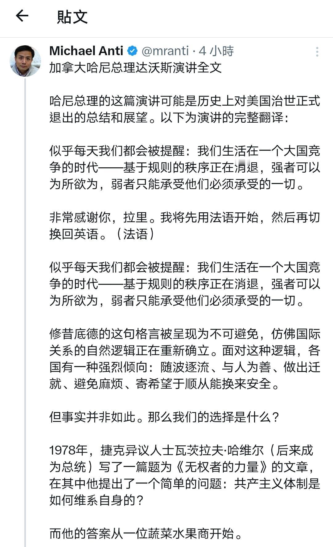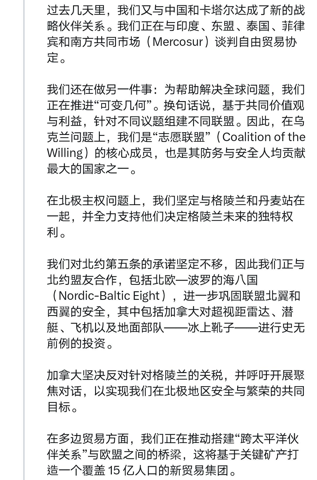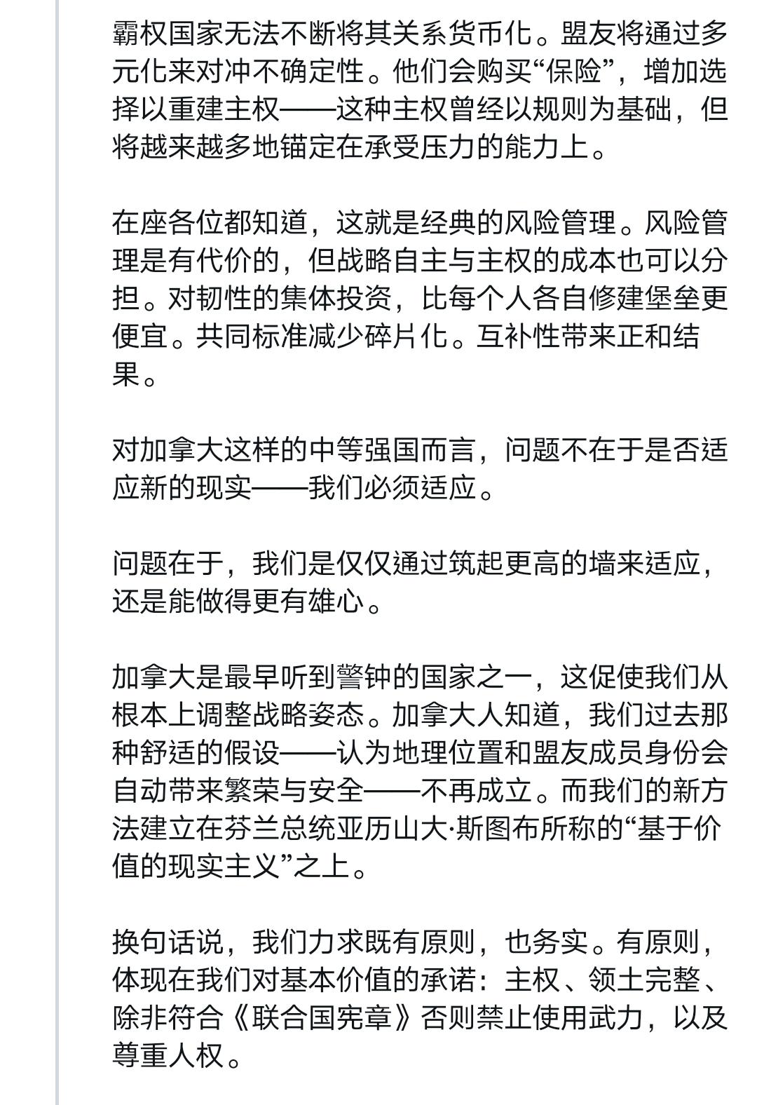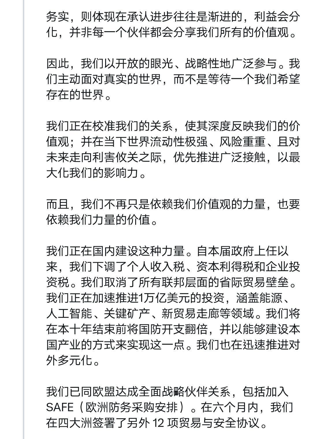 这应该是近些年来西方国家政要最深刻的反省——卡尼达沃斯演讲全文 我得说,卡尼在达沃斯的演讲是真诚、勇敢的,他说出了很多西方人不敢说出的话。 过去很长一段时间,西方多国过去拥护“基于规则的国际秩序”,本质是贪恋它带来的稳定与可预测性,认为这是长久繁荣的保障,甘愿自欺欺人维系幻象。 但这一切早已改变。旧秩序彻底断裂,美国霸权式微后,经济一体化沦为大国胁迫工具,多边机构摇摇欲坠,曾经的稳定与可预测性荡然无存。 卡尼直言不讳呼吁同侪:别再自欺欺人!他宣告加拿大要跳出幻象,秉持“基于现实主义的价值”前行——对内筑牢能源、矿产、国防硬实力,对外拓展多元合作,守住自身的稳定与主动。 作为吹哨者,他点破了西方的集体自欺。旧秩序的稳定一去不返,与其沉溺过往,不如直面现实、主动破局,这便是卡尼想传递的核心清醒。 我想摘取他演讲中的平实却极具震撼力的一段出来,应该可以作为所有以美国马首是瞻的西方国家的借鉴,他这样说道: 「所幸,我们还有另一项优势:我们认识到正在发生什么并决心据此行动。我们明白,这场裂变需要的不只是适应;它需要对真实世界的诚实。」 「我们正在把窗里的招牌撤下来。」 「我们知道旧秩序不会回来了。我们不应为它哀悼。怀旧不是战略,但我们相信,从裂缝中我们可以建造出更大、更好、更强、更公正的东西。这是中等强国的任务——这些国家在『堡垒世界』中损失最大,却在真正合作中获益最多。」 「强者拥有他们的力量。但我们也有一样东西:停止假装的能力,指认现实的能力,在国内建立实力的能力,以及共同行动的能力。」 「这就是加拿大的道路。我们公开而自信地选择它而且这条道路向任何愿意与我们同行的国家敞开。」 如果非得鸡蛋里挑骨头,那就是卡尼其次可以更真诚、更勇敢一些,也批评加拿大的伪善和假主权,为它的凤凰涅槃打下更坚实的基础。 Source: X