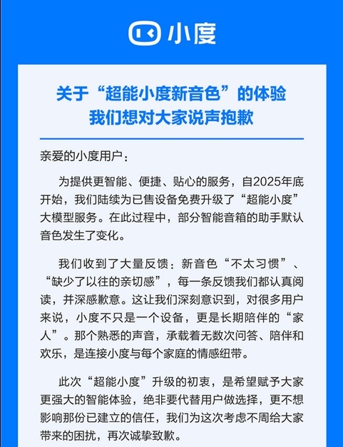 百度小度为用户广泛不适致歉今日上午,百度旗下人工智能品牌“小度”通过其官方账号发布致歉信,就近期“超能小度”升级后默认音色变化引发的用户广泛不适进行道歉,并宣布已第一时间完成优化。据介绍,事情源于小度自2025年底起,为已售智能音箱设备免费升级“超能小度”大模型服务。然而,在此过程中,部分设备的助手默认音色被改变。随后,小度方面收到了大量用户反馈,表示新音色“不太习惯”“缺少了以往的亲切感”。致歉信中,小度方面表示每一条反馈都已认真阅读,并深感歉意。