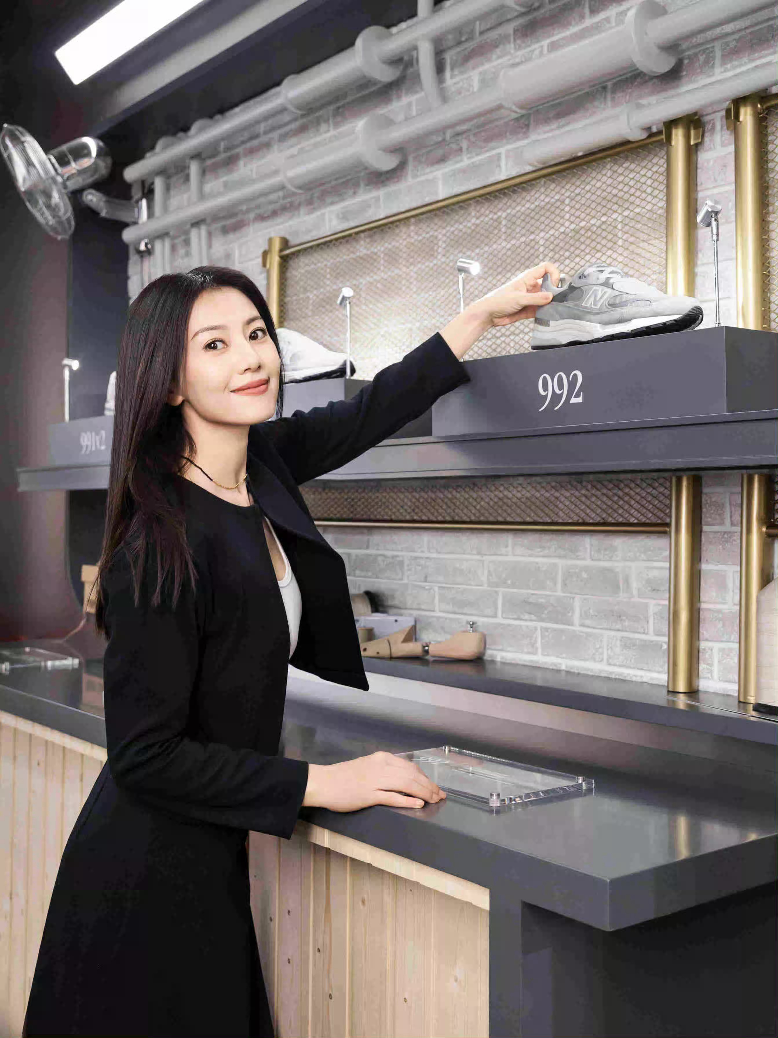 一身简约黑裙造型优雅又干练,举手投足间尽显松弛大气的美感。她轻触New Balance 992鞋款的动作自然流畅,在工业风店铺的衬托下,既诠释了品牌质感,又彰显出成熟女性的从容魅力。高圆圆