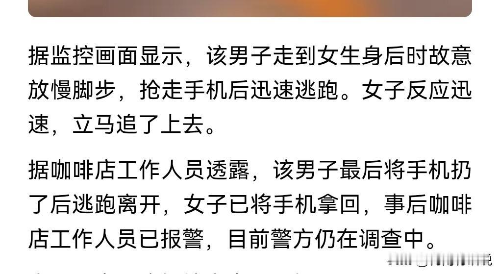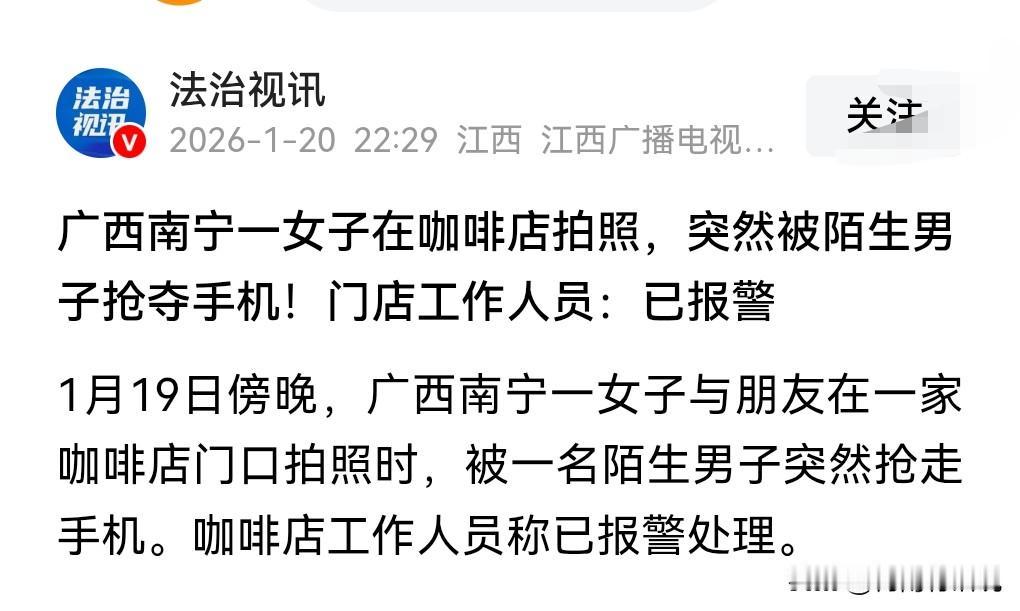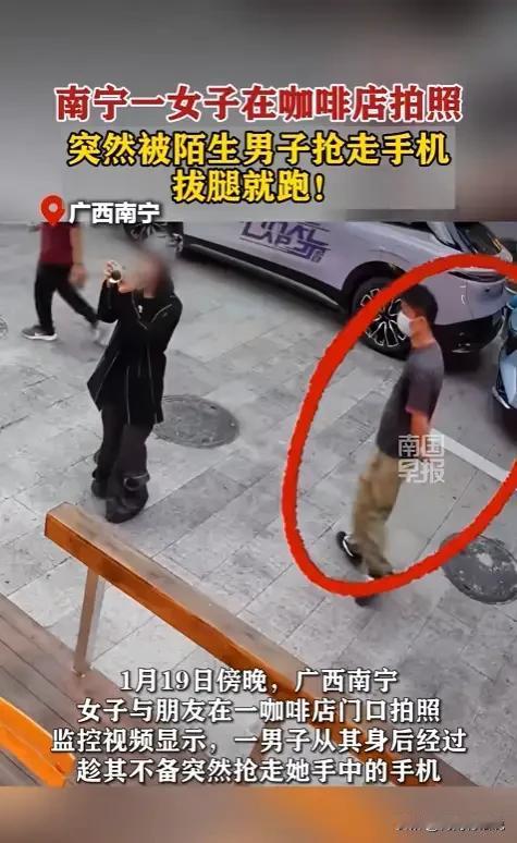 这真是让人看得一脸懵啊,想不到现在还有抢手机的。 1月19日傍晚,广西南宁,女子咖啡店拍照被陌生男子抢手机。 女子最后追了上去,男子扔掉手机逃跑,手机最终回到了女子的手里。 也不知道这男的是图什么。 必须严惩。