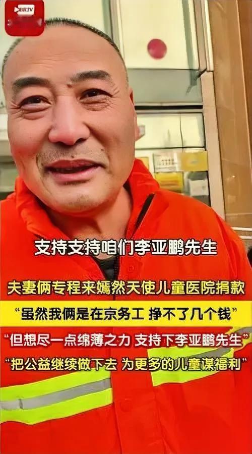 打工夫妻急捐钱为哪般? 寒风中他俩直奔嫣然医院 一对园林绿化工人夫妻,揣着辛苦钱请假赶路,就为亲手把捐款送到李亚鹏的医院。丈夫面对镜头紧张又坚定:"想看看他办的医院,喊他一声先生!"这话听着朴素,却藏着最沉甸的认可。 这对夫妻挣的是日晒雨淋的血汗钱,平时连误工都心疼,却愿意为公益停下手里的活。他们或许说不出华丽辞藻,却用行动把"支持"写得明明白白——不是大富大贵的施舍,而是普通人掏出心窝的热乎劲。那句"李亚鹏先生",是看在眼里、信在心上的敬重,比任何数据都有分量。 总有人觉得公益得靠大钱撑场面,可这对夫妻偏让人懂了:善意从来不分身份高低。你捐一百,我捐五十,凑起来就是照亮孩子的光。比起明星光环,普通人愿意用真金白银投票的公益,才更见人间烟火气。 这事最暖的是什么?是平凡人心里那份未被生活磨凉的柔软。你怎么看这对夫妻的选择?咱们评论区聊聊,看看这星星之火,能燎出多少人心底的热!