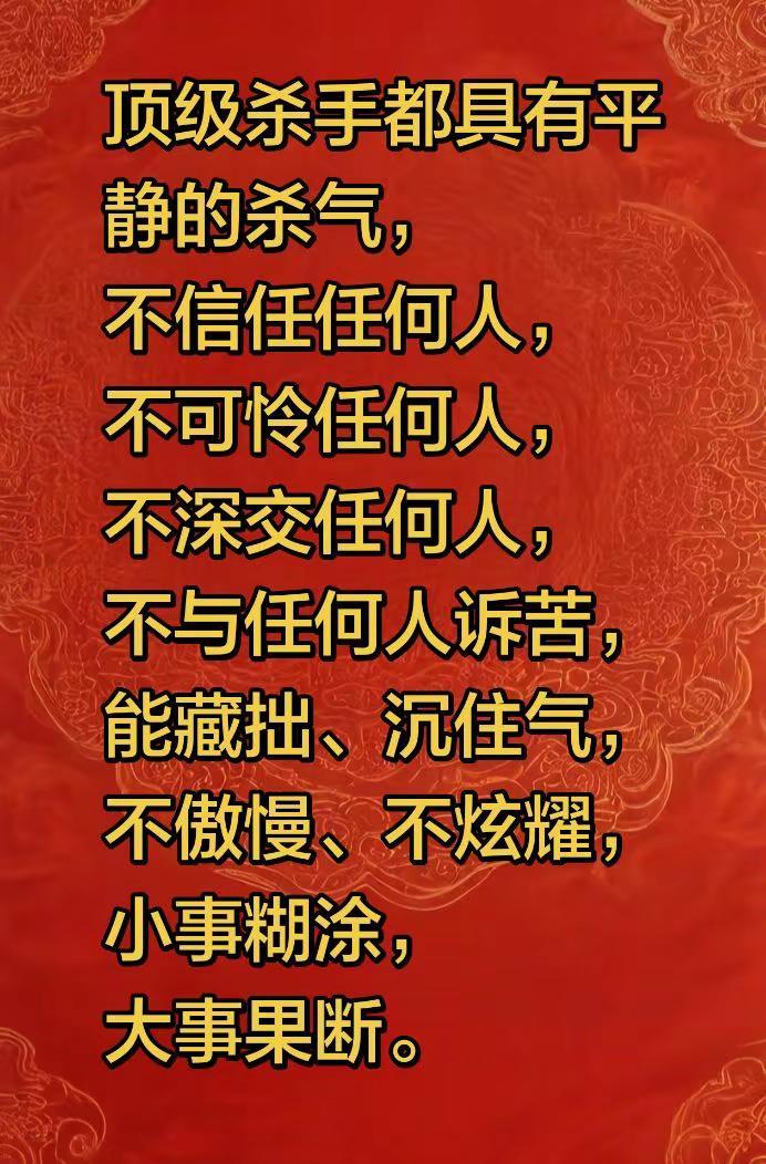 顶级杀手都具有平静的杀气,不信任任何人,不可怜任何人,不深交任何人,不与任何人诉苦,能藏拙、沉住气,不傲慢、不炫耀,心思缜密,小事糊涂,大事果断、内心祥和。