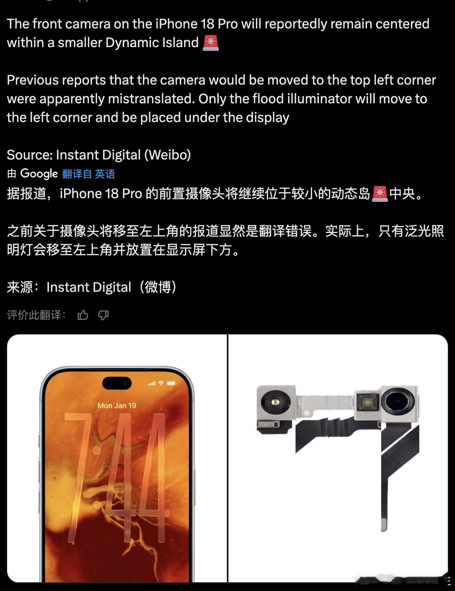 iPhone18Pro灵动岛或变小Apple 说过的,苹果不可能把摄像头移至左上角,这是对苹果设计的侮辱!外媒证实,iPhone 18 Pro 的前置摄像头将继续位于较小的灵动岛,实际上,只有泛光照明灯会移至左上角并放置在显示屏下方,之前左上角的传闻是“翻译错误”...