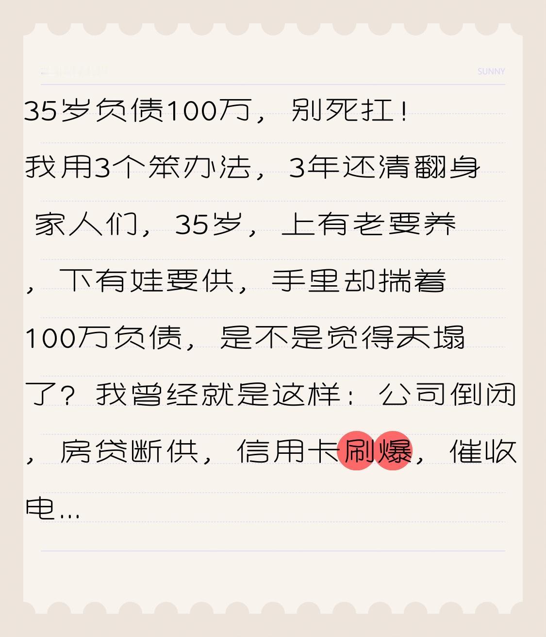 35岁负债100万,别死扛!我用3个笨办法,3年还清翻身 家人们,35岁,上有老要养,下有娃要供,手里却揣着100万负债,是不是觉得天塌了?我曾经就是这样:公司倒闭,房贷断供,信用卡刷爆,催收电话打到亲戚朋友那儿,每天一睁眼就是“该还钱了”,甚至想过一走了之!但今天我想告诉你,100万不是命,35岁更不是绝境,我靠3个笨办法,3年还清所有债,现在日子稳了! 先跟你说句掏心窝的:35岁负债,最可怕的不是钱没了,是你被压力压垮,破罐子破摔!我刚破产那会,把自己关在出租屋,喝闷酒、打游戏,老婆哭着说“要不离婚吧,我带着孩子回老家”,父母一夜白头,劝我“实在不行就认了”。那时候的我,觉得自己就是个废物,连家都撑不起。 转折点来了! 那天我儿子拉着我的手说“爸爸,我想喝牛奶”,看着他瘦巴巴的脸,我突然扇了自己一巴掌:我不能垮!我是男人,是家里的顶梁柱!当天晚上,我就拿出纸笔,做了第一件事——清算债务,停止内耗! 我把所有负债列成清单:房贷40万、信用卡30万、私人借款20万、网贷10万,一笔一笔标清楚利率和还款日。然后主动联系债主:跟银行申请房贷延期+停息挂账,跟信用卡中心协商分期60期,跟亲戚朋友说明情况,承诺每年还5万,绝不跑路!态度诚恳,把丑话说在前面,大部分人都愿意给我时间,催收电话少了80%,心里的石头终于落地。 第二件事,放下面子,疯狂搞钱! 我以前是公司老板,手下管着十几个人,现在为了挣钱,什么体面都扔了。白天去工地做监理,月薪8000;晚上去夜市摆摊卖炒粉,一晚上能赚300-500;周末不休息,去做代驾,跑一趟能赚100多。有人认出我“以前的王总”,嘲笑我“怎么混这么惨”,我笑着说“靠自己双手挣钱,不丢人!” 第一个月,我攒了2万8,全还了利息最高的网贷,那种踏实感,比以前赚100万还开心。 第三件事,利用人脉,做熟人生意! 35岁的优势,就是你积累的人脉和经验!我以前是做建材生意的,知道哪些产品质量好、价格低,就联系以前的客户,帮他们对接货源,赚中间差价。一开始没人信我,我就先垫钱送货,用口碑说话,慢慢的,老客户带新客户,一个月能赚1-2万。后来我又学了短视频,拍工地上的日常、摆摊的经历,分享负债翻身的感悟,没想到吸引了很多粉丝,有人找我做建材咨询,有人请我做创业指导,副业收入越来越高! 现在3年过去了,我不仅还清了100万负债,还重新开了一家小建材店,月入稳定2万+。回头看那段日子,苦是真的苦,但也让我明白:35岁的负债,不是人生的终点,而是让你沉下心来,重新认识自己、积累实力的起点。 人到中年,谁还没点坎?负债不可怕,失业不可怕,可怕的是你失去了从头再来的勇气。只要你不放弃,肯弯腰、肯吃苦、肯动脑,就没有翻不了的山!如果你现在也面临同样的困境,别慌,评论区留下“加油”,我们一起抱团取暖!点赞关注,下期分享我跟债主谈判的10个实用技巧!