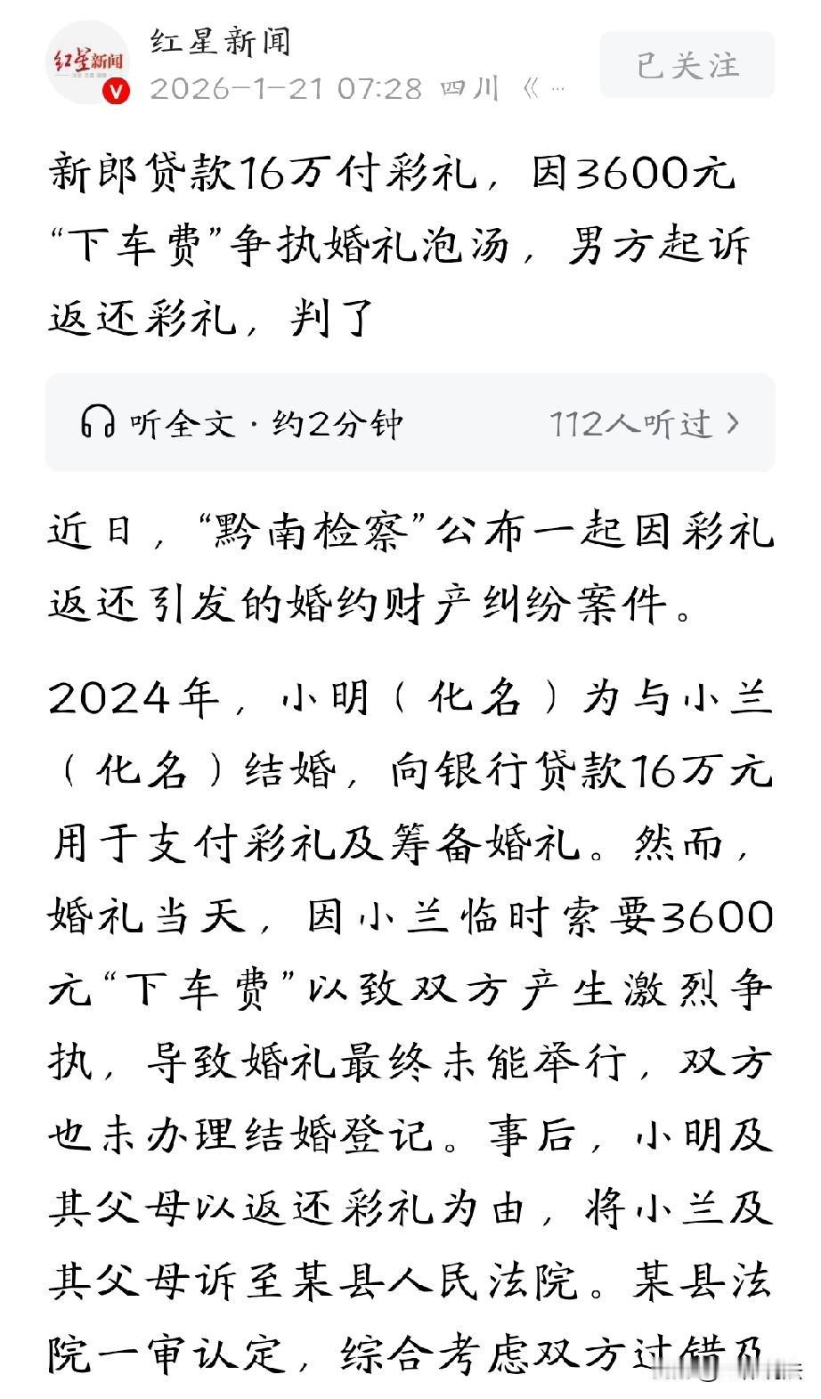脱单还是脱贫?贵州,男子为了娶媳妇,在银行贷款16万元给女方当彩礼,可万万没想到,婚礼当天,女子突然下口,再要3600元的下车费。男子一时实在拿不出这么多钱,便低三下四的哄她劝她,甚至表示婚礼之后补给她,但女子态度坚决,不给钱就是不下车。这下把男子惹毛了,双方大吵一架,婚礼也黄了。事后,男子一气之下告上法庭,要求女方返还彩礼,法院判了。 2024年,小明和小兰经人介绍相识,在双方家人的不断催促下,两人开始商量结婚的事。 小明家境不太好,可为了能顺利将媳妇儿娶进门,他还是按照当地习俗,咬牙答应女方,给小兰16万彩礼。 这么一大半钱,就是砸锅卖铁他也拿不出来,亲戚们也凑不出这些钱来,无奈之下,他咬着牙从银行贷了16万,交给女方。 婚礼当天,小明穿上西装皮鞋,满心欢喜地迎娶小兰,可谁能想到,当婚车到了地方,小兰却突然提出要3600元的下车。 小明一下子就懵了,为了筹办这场婚礼,家里已经债台高筑,到处都欠着钱,这会儿实在拿不出这3600元。 亲朋好友那么多,小明非常尴尬,他赶紧好声好气地跟小兰商量,看能不能先下车,把婚礼仪式办了,之后他一定想办法补上。 可小兰才不管这些,她态度强硬,不给3600元就坚决不下车。 当着那么多人的面,小明实在有些下不来台,他又说了很多好话哄劝小兰,但她始终无动于衷。 终于,小明忍不住了,两人大吵了一架,好好的一场喜事就这么黄了。 本想着办完婚礼就去领结婚证,事没办成,事后两人也没有去办结婚登记。 为了这场婚礼,家里在银行贷了款,还借了一大堆,既然结不了婚,那这钱肯定得要回来,万不能人财两空。 于是,小明找到小兰,希望她返还彩礼,谁知,对方态度十分恶劣,要钱就是没有。 一气之下,小明将小兰及其父母告上了法院,要求全额返还彩礼。 《关于适用〈民法典〉婚姻家庭编的解释(一)》第五条规定:当事人请求返还按照习俗给付的彩礼的,如果查明属于以下情形,人民法院应当予以支持:(一)双方未办理结婚登记手续;(二)双方办理结婚登记手续但确未共同生活;(三)婚前给付并导致给付人生活困难。 小明与小兰未办理结婚登记,婚礼也没有举办完成,更没有共同生活的经历,完全符合本条的法定返还情形。 法律虽规定应当返还,但并非“全额返还”。 法院通过考量双方过错,小兰临时索要下车费、拒不下车导致婚礼破裂,过错更大、彩礼实际用途、当地习俗及小明家庭经济困难等因素,扣除合理开支与过错折抵,法院判决小兰方返还彩礼14.9854万元。。 小兰方觉得这判决不公平,心里不服气,提起上诉,但二审法院维持原判。 判决生效后,小兰死皮赖脸,一直没履行还款义务,小明没办法,只能向法院申请强制执行。 《民事诉讼法》第246条规定:发生法律效力的民事判决、裁定,当事人必须履行,一方拒绝履行的,对方当事人可以向人民法院申请执行。 二审维持原判后,判决已生效,小兰方负有法定履行义务。其拒不返还剩余彩礼,小明依法向法院申请强制执行,是法律赋予的救济权利,程序正当。 法院尽力去执行,可只执行到位4万余元,因为小兰方实在没什么可供执行的财产,在2025年6月的时候,法院只能裁定终结执行。 这下小明家可犯难了,为了这彩礼,家里背了银行的贷款,每个月都要还钱,经济上困难得很。 而小兰方却说自己把彩礼都用于筹备嫁妆、婚礼开支,还有偿还旧债了,实在没钱全额返还。 小明方咽不下这口气,这么多钱,凭什么白白便宜了你,于是他多次上访,可这案件就这么陷入了僵局,一直都没个解决办法。 直到2025年9月2日,在法检的共同努力下,双方终于达成了执行和解。 小明为了尽快要回剩余部分,就放弃了迟延履行利息约8000元,小兰也凑齐了钱,当日一次性支付了剩余执行款10.97万元。 小明拿到钱后,心里的大石头总算落了地,随即撤回了监督申请。