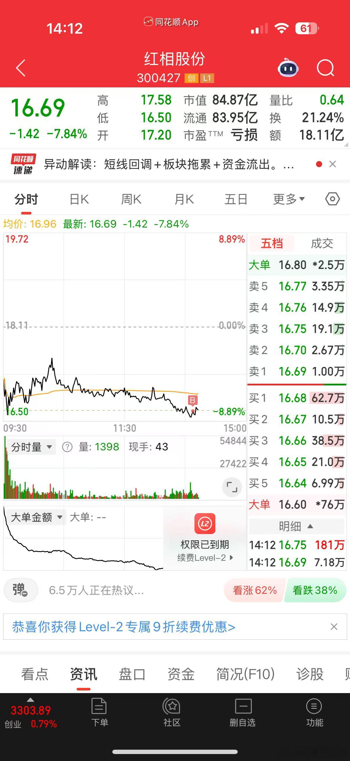 雷科防务跌的太惨了,早盘低开稍微震荡后不断下跌,恐慌盘持续割肉出逃,午后有一波小