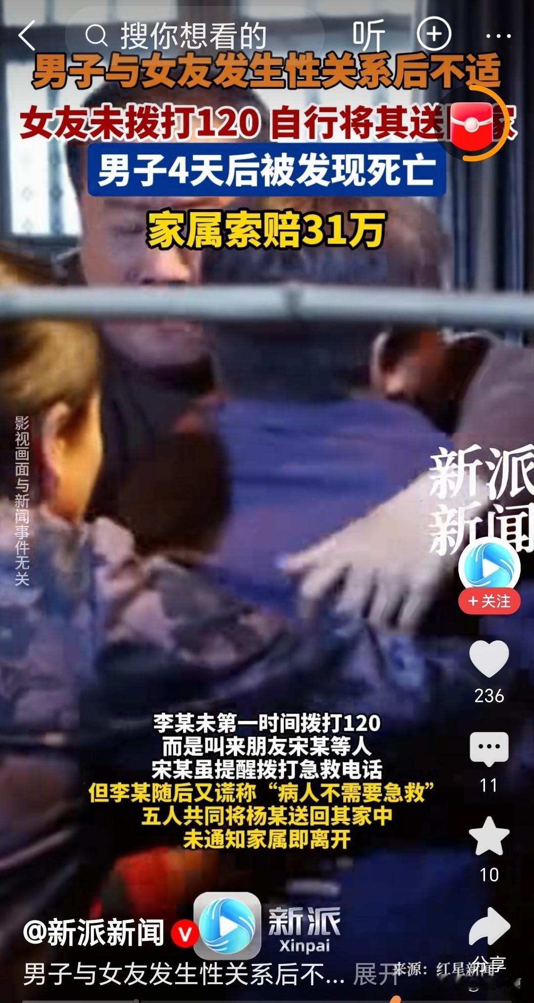 丧偶独居的66岁男子杨某与女友李某发生关系后身体不适,被女友送回家中,四天后,杨某被儿子发现已在家中离世。 杨某儿子事后认为,李某在事发时未在第一时间拨打120,而是叫来朋友宋某等人,宋某虽提醒拨打急救电话,但李某随后又谎称“病人不需要急救”为由而取消呼叫。随后,李某与4名朋友共同将其父亲杨某送回家中,并未通知他家人即自行离开了。儿子为此将李某及其朋友告上法庭,索赔31万。 经法院审理,最终判决李某赔偿4万元,宋某等四人各赔偿2500元,合计赔偿共5万元。 案例引发网友不同看法。更多的是认为杨某其家属未体谅老人独居的孤独,老人去世后,还因此事损害其名声。 在我看来,独居老人,在自身条件许可的情况下,可不可以学学我的这位老同事。 这位老同事退休不久便失去老伴,之后轮流在两个儿子家生活,日子过得还算舒心。 他没有什么别的爱好,就是喜欢到社区老人活动中心去聊天、打牌、下棋。在那里,他结识了同样独居多年的华大嫂。两人性格相投,兴趣相近,渐渐萌生了相互陪伴的念头。 有了这种想法后,两位老人各自回去征求子女意见。华大嫂的子女表示支持,而老同事两个儿子坚决反对,甚至扬言若父亲与华大嫂在一起,就断绝父子关系。 然而,我这位老同事没有屈从于两儿子的压力,毅然选择了与华大嫂生活在一起。 至今,两人已相互陪伴近十年,随着时间流逝,双方儿女也逐渐放下成见,开始相互走动了。如今,老同事已87岁,华大嫂也近80岁,两人精神矍铄,除了偶尔走亲访友或身体不适外,几乎每天都会一起去活动中心,晚年生活极其充实愉快。 回过头来看案例中的杨某,其实也曾想与李某在一起生活。却因家人因李某“贪图钱财”而遭到阻挠,最后只得以朋友身份与李某交往。 现在想想,如果当时家人能多一些理解,或者杨某能更坚定一些,或许结局不会这样。 男子与女友同房4天后死亡 家属索赔