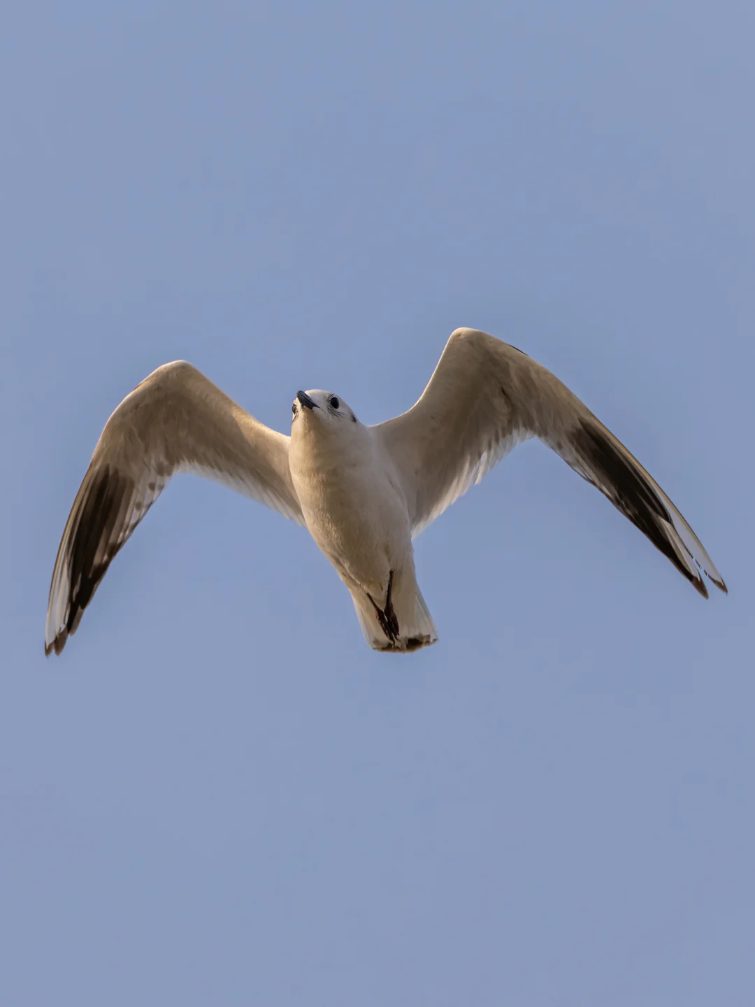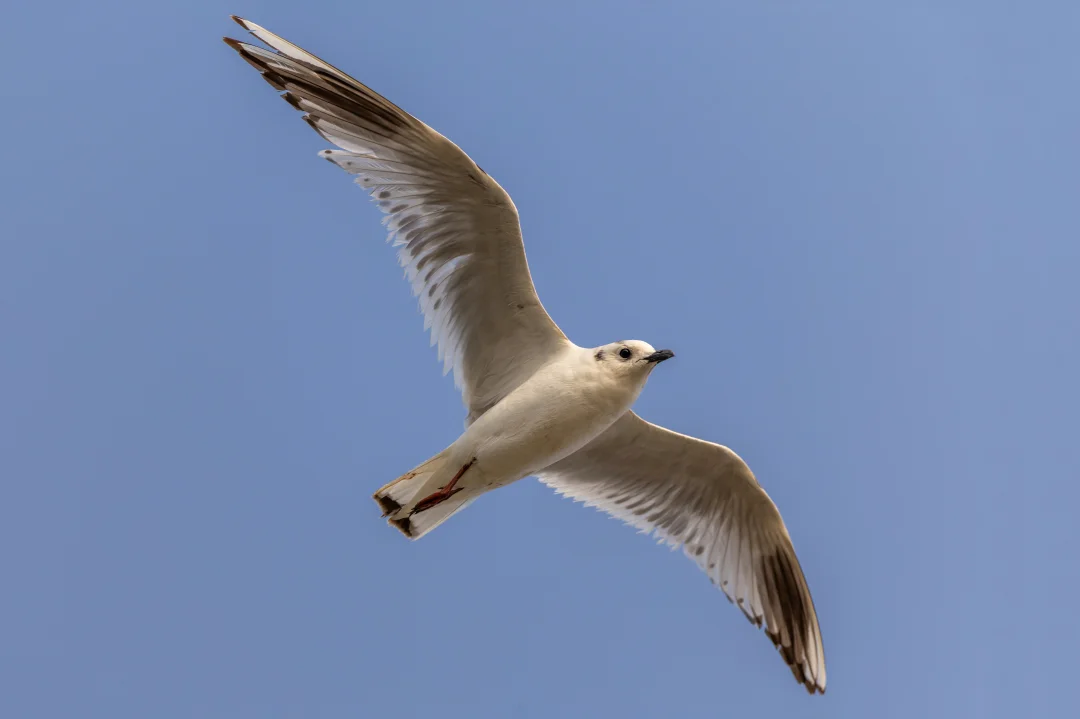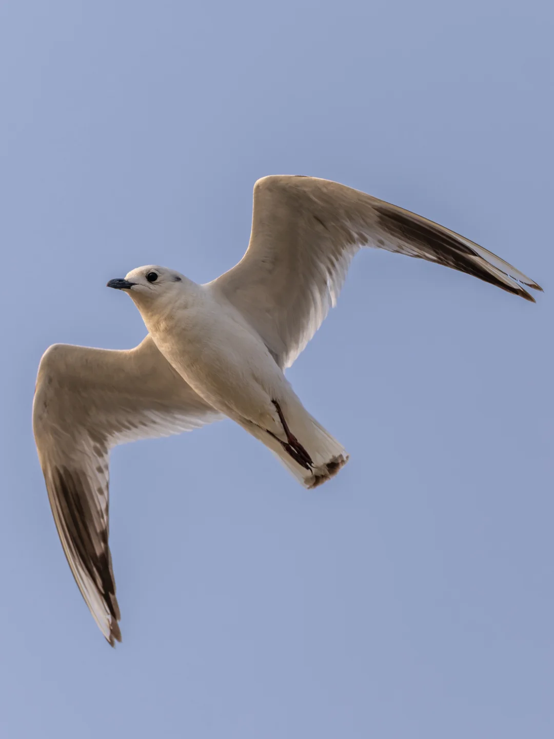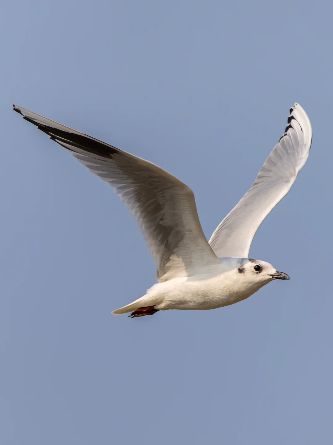 黑嘴鸥看上去非常优雅,体型娇小,从名字可以看出,它们显著特征是全黑喙。繁殖季头部全黑,不过现在是冬季,它们头部白色,眼前后各有一个黑斑。第一冬羽的翅膀图案和红嘴鸥非常像,但头部以及粗重的黑喙像小鸥,比小鸥稍微大一点。