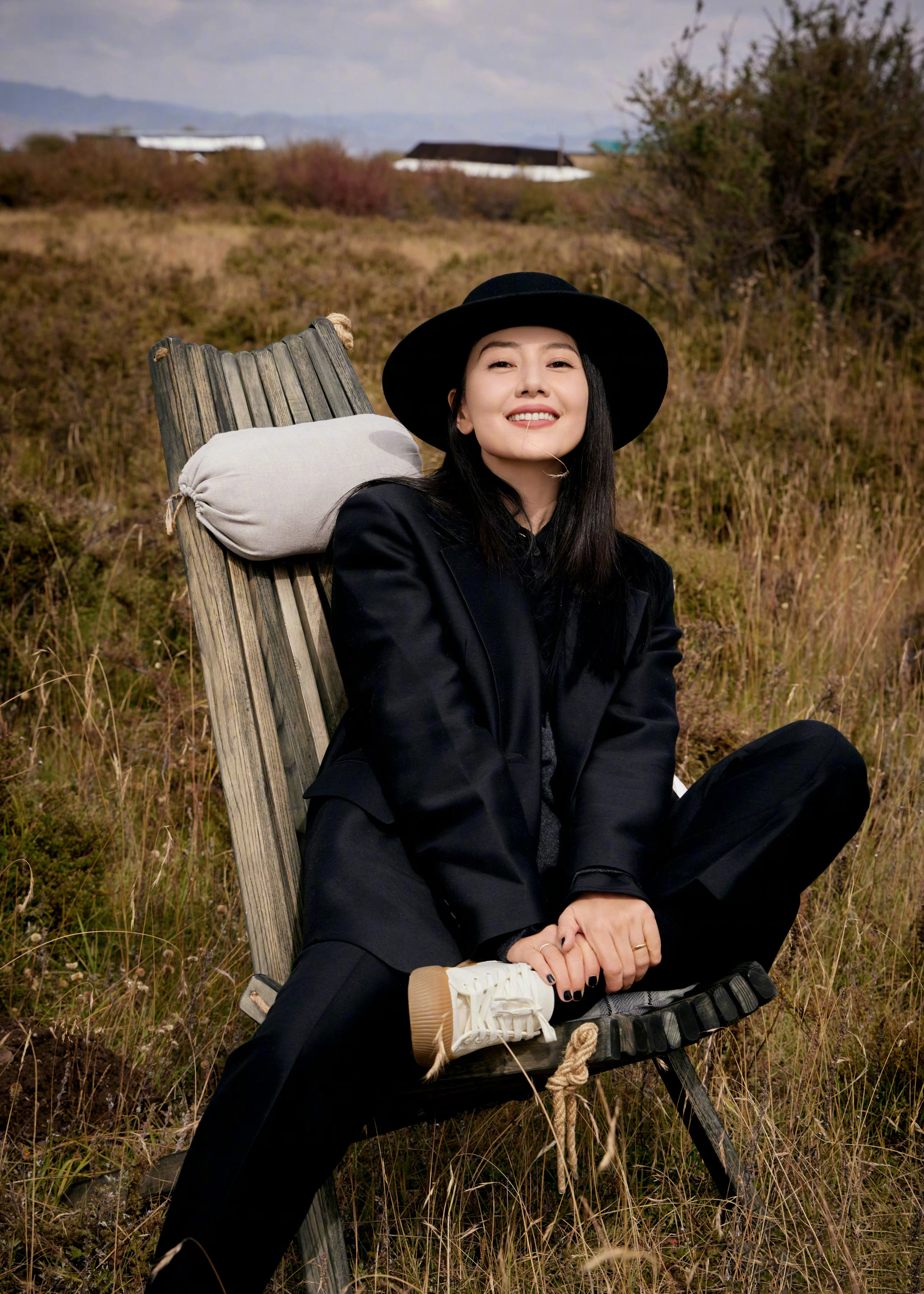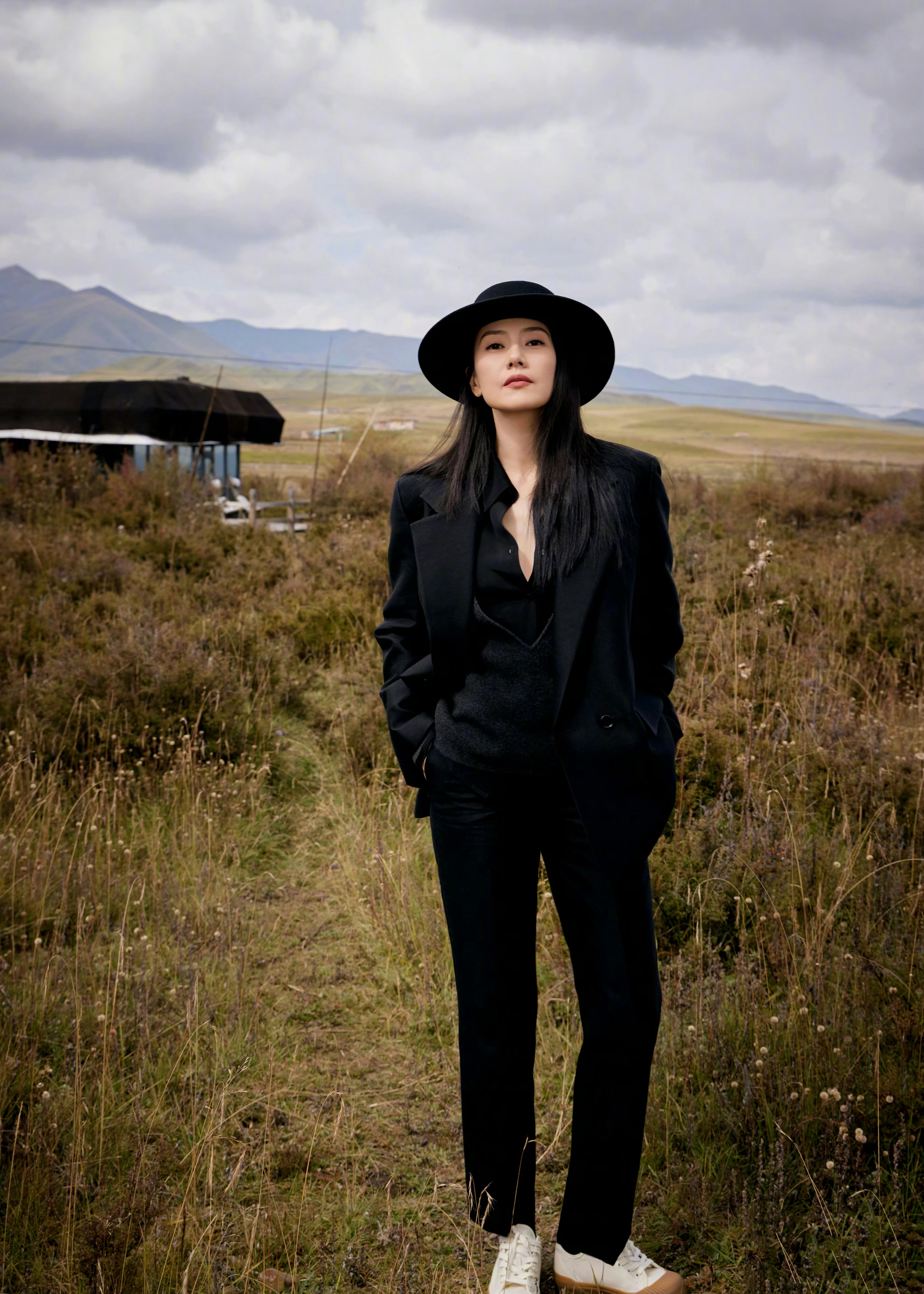 这组旷野大片里,一身极简黑西装搭配宽檐帽,在枯黄草甸与远山云团的衬托下,既有都市精英的利落,又融入了旷野的松弛感。她的神态沉静又带着疏离感,黑白配色与苍茫天地形成强烈视觉张力,既保留了她标志性的温婉气质,又多了几分历经沉淀后的飒爽与从容。高圆圆