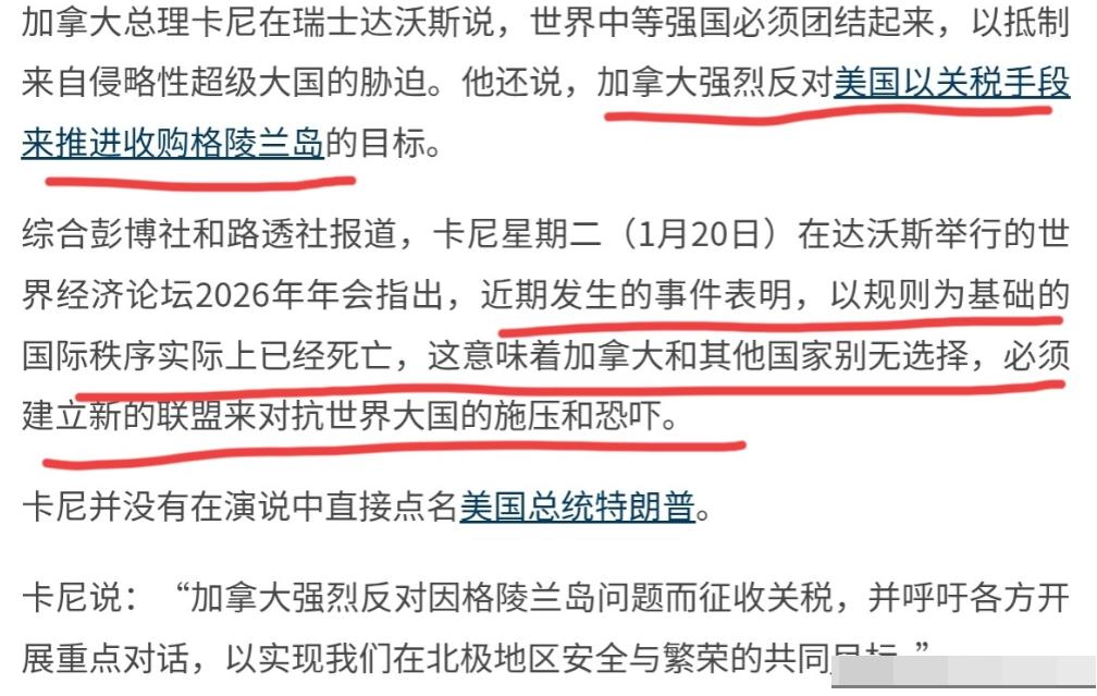 加拿大对美国这是有多失望,才能说出这一番话!1月21日,结束访华的加拿大总理卡尼在瑞士达沃斯论坛上表示,近期发生的事件表明,以规则为基础的国际秩序实际上已经死亡,这意味着加拿大和其他国家别无选择,必须建立新的联盟来对抗世界大国的施压和恐吓。 卡尼表示,别再把‘以规则为基础的国际秩序’挂在嘴边,就好像它还能发挥作用。我们得认清当前的体系,这是一个最强大国家利用经济一体化作为胁迫武器来追求自身利益的时代。 很显然,卡尼敢在达沃斯这种全球大佬云集的场合说这番话,说白了就是加拿大被美国拿捏得太久,终于忍不住当众摊牌了,那份藏在骨子里的失望都快从话里溢出来了。 要知道加拿大和美国向来被外界绑在一起,说是盟友不如说是加拿大长期活在美国的“保护伞”下,只是这把伞这些年早就变了味,成了美国薅盟友羊毛、实现自身利益的工具。 所谓的“以规则为基础的国际秩序”,不过是美国量身定制的遮羞布,有用就挂在嘴边,没用就随手扔掉,加拿大算是把这点看透了。 卡尼刚结束访华就放出这番言论,本身就很有深意,一边是和中国达成经贸合作路线图,解决油菜籽出口、电动汽车关税等实际难题,一边是在国际论坛上否定美国主导的秩序,这一进一退之间,恰恰印证了美加那种天然盟友关系的崩塌。 美国对加拿大的胁迫从来都不带掩饰,全是实打实的利益压榨。就说贸易领域,特朗普上台后对加拿大的关税大棒就没停过,先是把钢铝产品关税从25%直接上调到50%,理由牵强到可笑,一会儿说加拿大在芬太尼问题上不作为,一会儿又不满加拿大的报复性措施,明眼人都能看出来,就是想靠着自身优势逼加拿大妥协。 更过分的是,还专门针对加拿大货物搞出转运关税,只要敢试图规避高关税转运,就额外加征40%的税,摆明了就是要把加拿大的贸易路堵死。 甚至公开嘲讽加拿大“占美国便宜”,诱导加拿大企业迁到美国,本质上就是想把加拿大变成自己的经济附庸,这种吃相难看的操作,换谁也受不了。 卡尼上台后之所以坚持对美国商品加征报复性关税,还反复强调要减少对美国市场的依赖,计划十年内将非美市场出口翻倍,就是被美国的贸易霸凌逼出来的无奈之举,也是失望累积后的必然选择。 能源领域的博弈更能看出美国的自私自利,所谓的盟友情谊在自身利益面前一文不值。 筹划多年的基石输油管道项目,本是加拿大想把油砂资源顺利输往美国墨西哥湾,带动双方产业发展,结果美国反复横跳,一会儿批准一会儿否决,硬生生把项目成本从54亿美元拖到80亿美元,最后以一票之差被否决。 美国嘴上喊着环保、就业等理由,实则是怕加拿大原油大量输入影响本土油价,更怕加拿大借着这条管道实现石油出口多元化,摆脱对美国的依赖。 要知道加拿大原油长期以来绝大多数都以折扣价卖给美国,本就处于被动地位,想修条北方门户管道向亚洲出口,又被美国暗中阻挠,这种既想把加拿大绑在自己能源体系里,又不愿给加拿大公平待遇的操作,彻底寒了加拿大的心。 卡尼说当前是“最强大国家利用经济一体化作为胁迫武器的时代”,这话精准戳中了要害,加拿大就是最直接的受害者。 美国口口声声说维护盟友利益,可一旦加拿大的决策不符合美国预期,就立刻动用制裁手段施压,比如加拿大表态要承认巴勒斯坦国,特朗普立马就威胁要搁置美加贸易协议,不到24小时就签署加征关税的行政令,完全不给邻国留任何余地。 这种单边主义的打压,让加拿大彻底认清,所谓的美国“治下”的和平,不过是让盟友无条件服从美国利益,一旦有异议就会被胁迫恐吓。 卡尼在达沃斯的表态,与其说是否定国际秩序,不如说是对美国霸权的公开反抗,是加拿大彻底跳出美加传统盟友框架的宣言。 那种天然依附美国、凡事和美国站在一起的时代,早就被美国一次次的利益压榨磨没了,美国亲手摧毁了自己主导的“规则秩序”,也亲手终结了和加拿大的特殊盟友关系,而卡尼的这番话,不过是把这个早已存在的事实,摆到了全球面前而已。