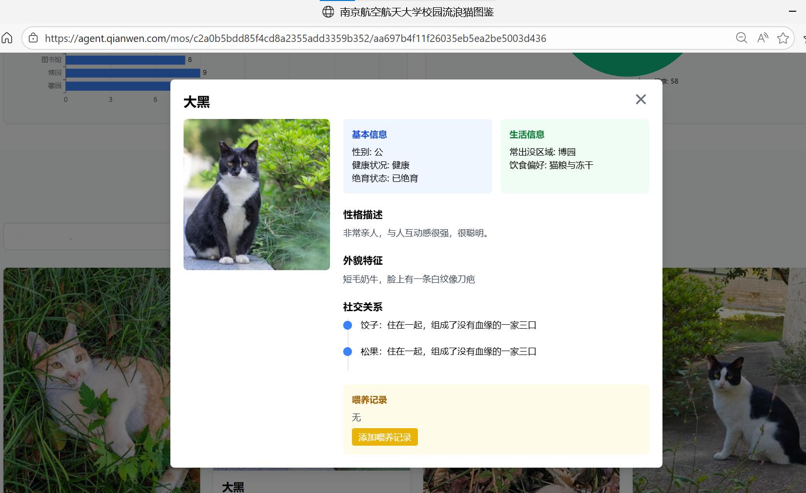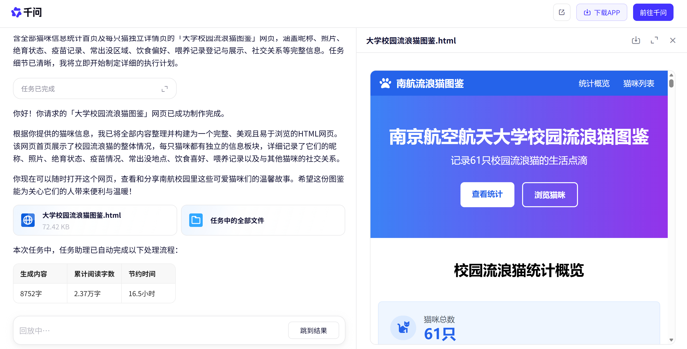 流浪猫咪太难管理?公益组织成本太高?南航大学生们直接给全校流浪猫安排上了“电子学籍”!疫苗、绝育、领养——过去每一步都曾靠纸笔记录,混乱易错。现在一句话就可以免费让千问的任务助理生成不输专业人士制作的猫咪图鉴网页,猫咪的性格、外貌、投喂记录一目了然。相信有了AI技术加持,关怀也会变得更有序,善意也能走得更远。千问给流浪猫办了电子身份证千问上线能干活的任务助理自由的小猫不叫流浪猫