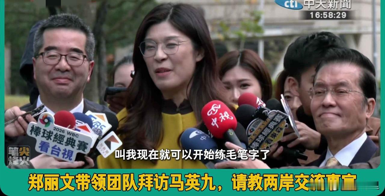 马英九一句“练毛笔字”,竟是郑丽文访陆的“第一课”? 国民党主席郑丽文率团拜访马英九,请教两岸交流事宜。马英九一句“叫我现在就可以开始练毛笔字了”,看似玩笑,实则暗藏深意。 毛笔字,是中华文化的根,是两岸同源的最直观象征。马英九以“练字”为喻,实则是提醒郑丽文:两岸交流,不是政治博弈,而是文化认同的回归。毛笔字讲究“笔锋藏锋、运笔沉稳”,正如两岸对话,需以柔克刚,以静制动,不急不躁,方能行稳致远。这不仅是对郑丽文个人的期许,更是对国民党未来两岸路线的隐喻:回归中华文化本位,以文化软实力破冰政治坚冰。 郑丽文面对众多媒体,神情认真,显然对此次拜访高度重视。马英九的“毛笔字”建议,实则是点出:两岸交流,不是“要不要去”的问题,而是“以什么姿态去”的问题。练字,是练心,是练态度,是练对中华文明的敬畏。 你们知道郑丽文写的字怎么样吗?引人遐想,或许这正是马英九“练字”建议的另一层深意——以字修身,以文化人,方能真正打开两岸对话的新局面。