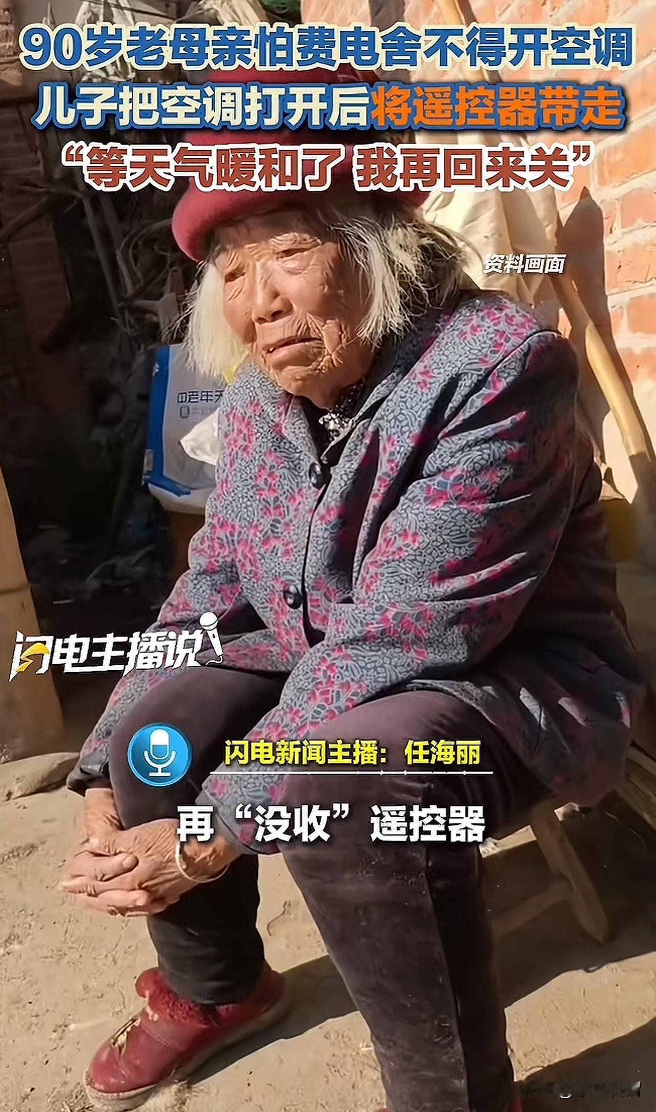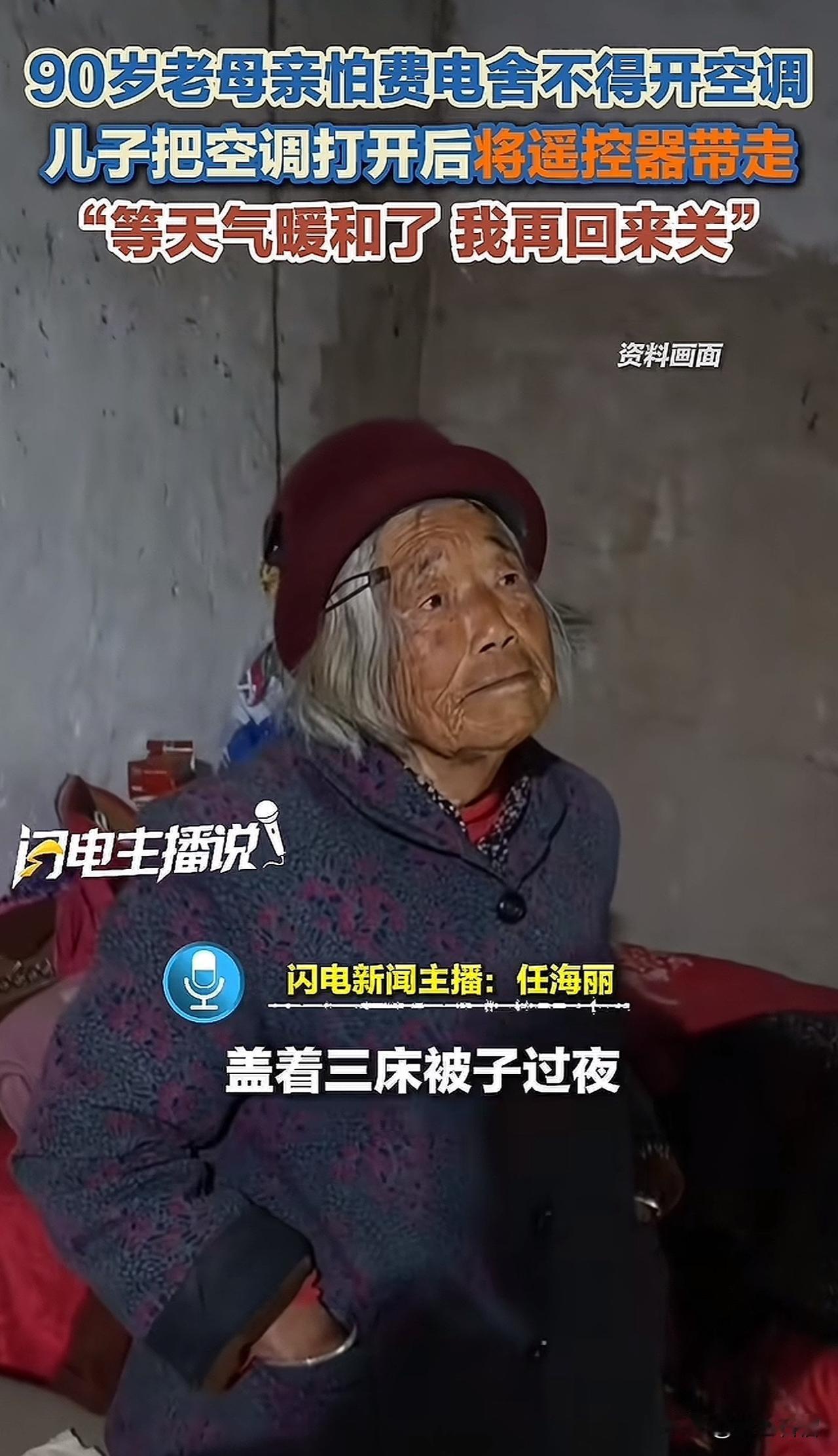 近日,安徽阜阳一位90岁老人,因心疼电费,在0度左右的低温环境下,坚持不开空调,盖着三床被子睡觉。 儿子放心不下老人,专门从外地赶回老家,只为做一件事,那就是打开空调,然后把遥控器带走。 儿子说:老房子室温常常零下,母亲总是嘴上说“不冷”,却裹着三层被子入睡,其实她是怕费电。 为了让母亲能温暖过冬,他决定“强硬”一回,打开空调,再“没收”了家里的遥控器,让母亲没法关掉。 王先生说:“等天气暖和了,我再回来关掉”。 小小的遥控器,藏着父母骨子里的节俭,也系着子女对父母的无限牵挂。有网友说:这才是最朴实的孝顺。 对于王先生为了不让母亲关掉空调带走遥控器一事,大家有什么想说的吗?欢迎评论区聊聊。 (图片来源网络)