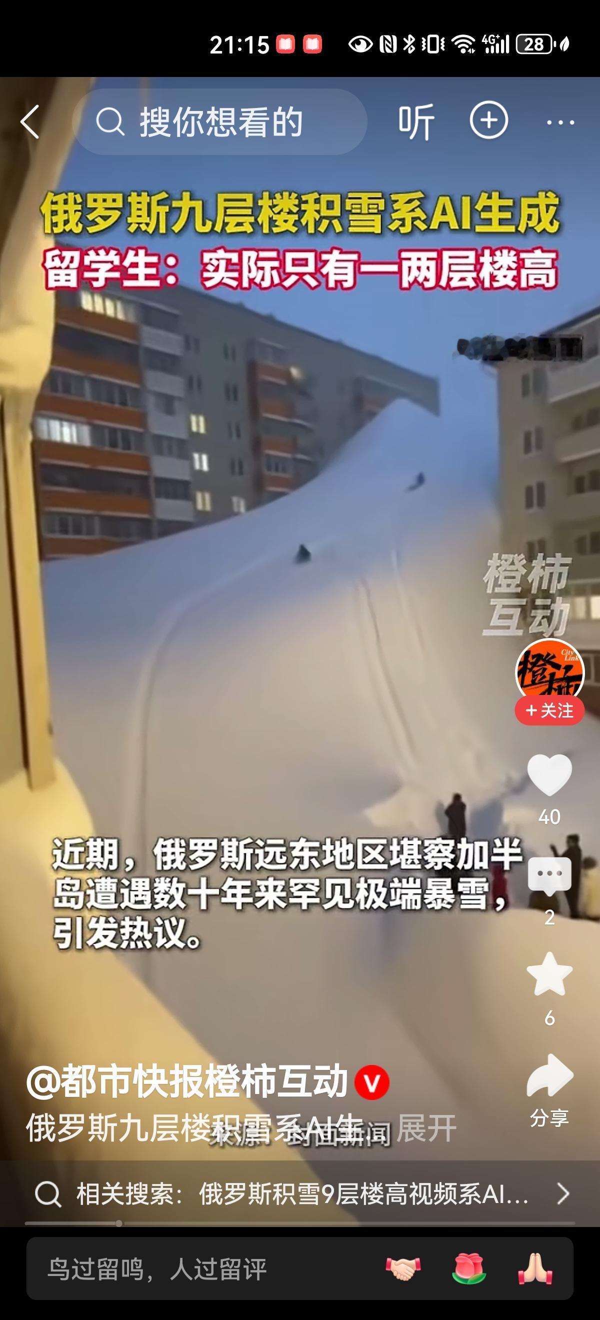 几段网传的视频差点欺骗了所有的网友。近期,俄罗斯远东地区堪察加半岛遭遇数十年来罕见极端暴雪引发关注。几段积雪几乎与9层楼高的公寓楼一样高,不少人直接从窗户跳入高耸的雪坡滑下的视频,在社交媒体传播。 这雪是不是也太大了!1月21日,记者从当地华人和俄罗斯媒体等多渠道获悉,这些视频大都是AI生成,这里的积雪最高也就一二层楼那么高。看来,AI技术的广泛应用有利也有弊,我们还真是要睁大眼睛,否则,随时都会被AI生成的“假视频”“假消息”给蒙蔽了。