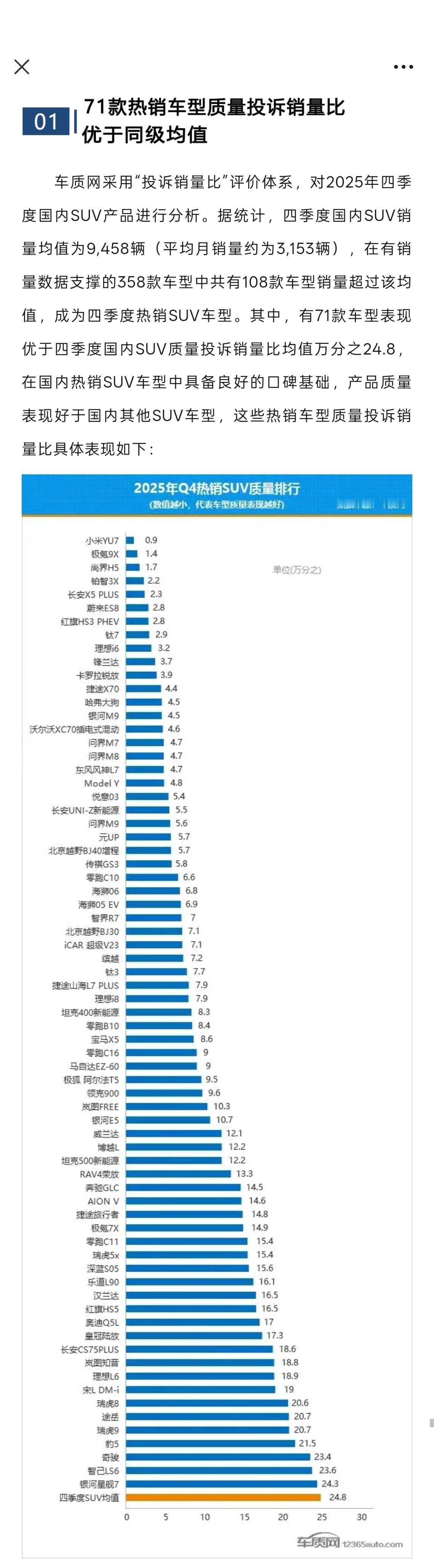 小米YU7获得SUV质量排名第一车质网的数据显示,小米YU7获得2025