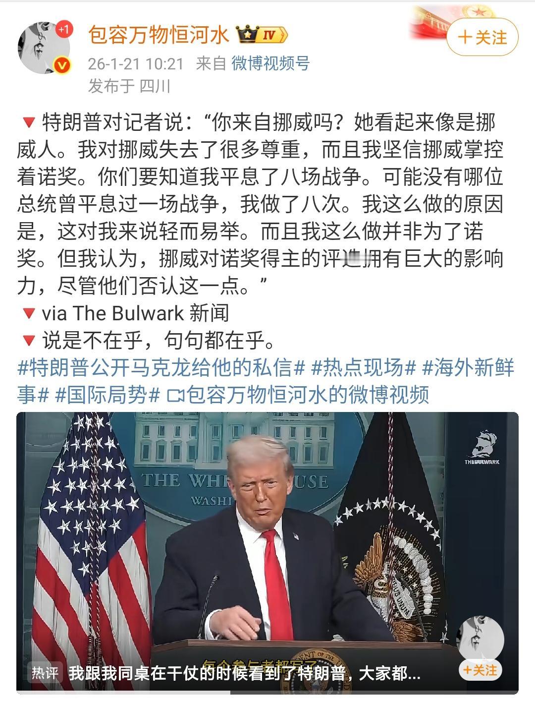 不行下一届诺贝尔和平奖颁给特朗普好了,他竟然又在提这个事情,他说他制止了8场战争! 虽然句句没有提诺贝尔和平奖,但是实际上句句说的都是诺贝尔和平奖,挪威也不希望介入与美国的纷争之中,就怕下一次美国对挪威加征100%的关税。