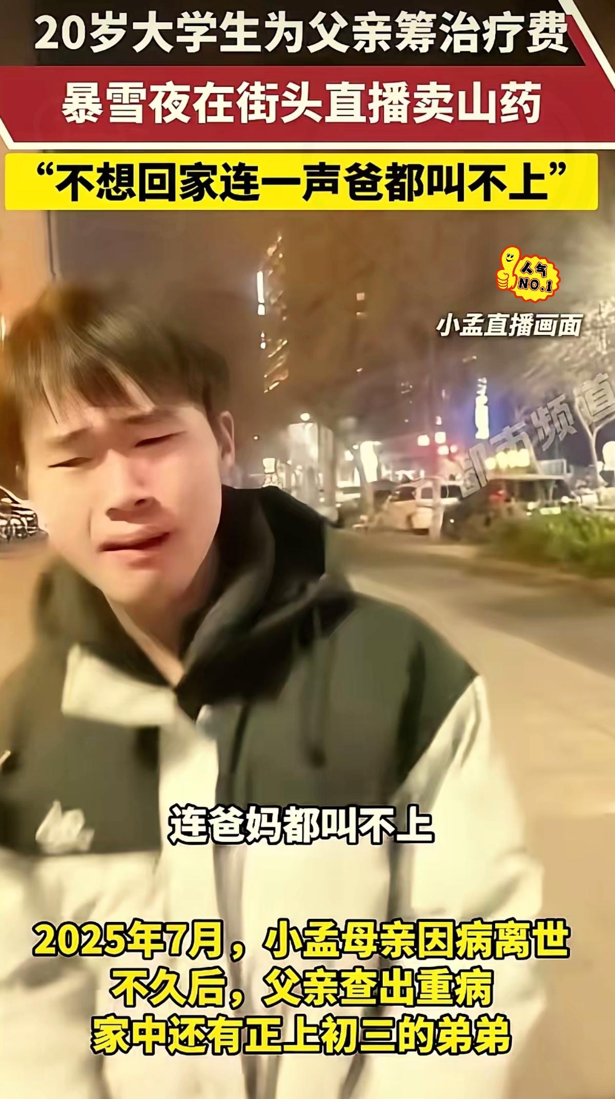 郑州大雪夜的街头,这个20岁男生的身影看哭无数人! 冻得搓手直播卖山药,被质疑作秀的背后,是少年独撑一个家的心酸与倔强。哪有什么天生的坚强,不过是妈妈离世、父亲重病,身后还有初三的弟弟,让他不得不把20岁的肩膀,硬扛起家的重担。 他的武术和舞蹈从不是博眼球的噱头,而是走投无路时,用尽全力挣来的生的希望,比起躺平抱怨的成年人,他的真诚和担当更显珍贵。我们总说年轻一代吃不了苦,可小孟让我们看到,风雨面前,他也能成为遮风挡雨的大人。那些看似不起眼的努力,都是他守护家人的执念,这份孝心和韧劲,值得所有人的温柔以待。 河南郑州小男孩 河南暖心男孩