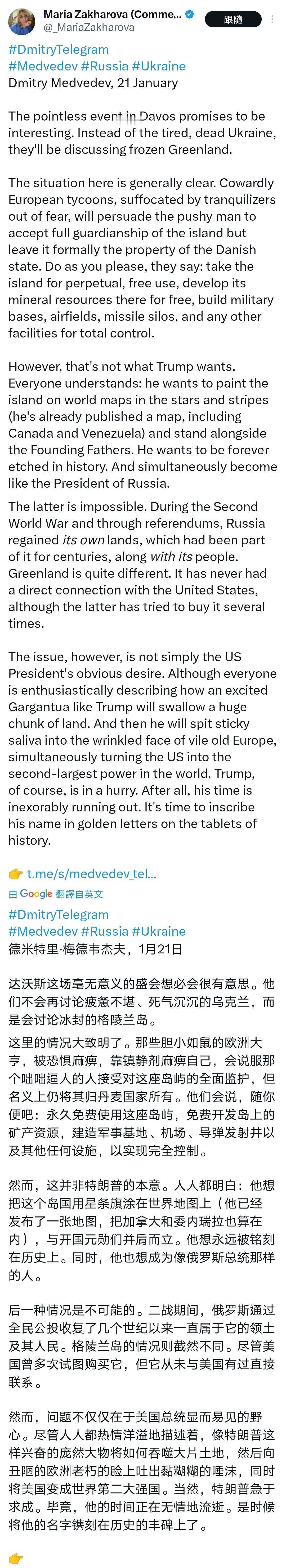 梅德韦杰夫对特朗普觊觎格陵兰的辛辣评论,与社交平台上 “特朗普必得格陵兰” 的喧嚣论调截然不同,反倒和我的判断不谋而合 —— 美国根本不可能得到格陵兰。 过去不能,现在更不能。至于未来,倒有一丝模糊的可能: 若美国从当下起,摒弃霸权胁迫那一套,实打实斥巨资深耕格陵兰,以长期合作、利益绑定的方式慢慢渗透,或许再过五十年、一百年,才有可能让格陵兰成为其领土的一部分。 但这绝非特朗普靠野心、靠社交平台造势就能实现的短期图谋。 最后闲说一句,梅德韦杰夫的文笔,在当今各国政治人物中,算得上上乘水准,犀利又通透,自带一种冷冽的洞察力。 而且一看就是自己写的! Source: X