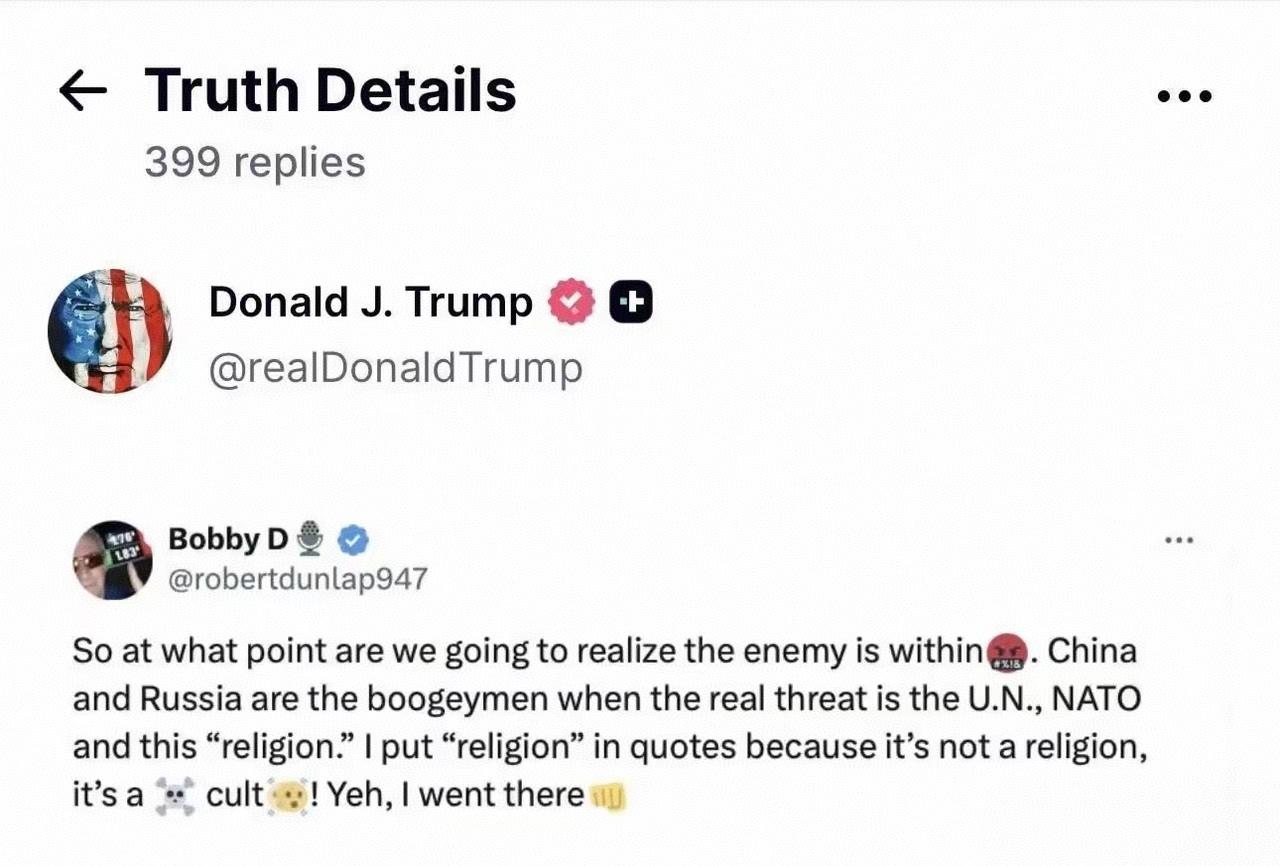 闹了半天,原来他所认为的敌人是联合国和北约还有国内的“邪教”,中俄在这老人家眼里还够不上敌人的称呼。 好可惜,要是这老人家可以再来一任那该多好,相信那一定会很精彩: 联合国被架空、北约被解散、南北战争2.0版。 大家讨论下这三点可能发生吗?