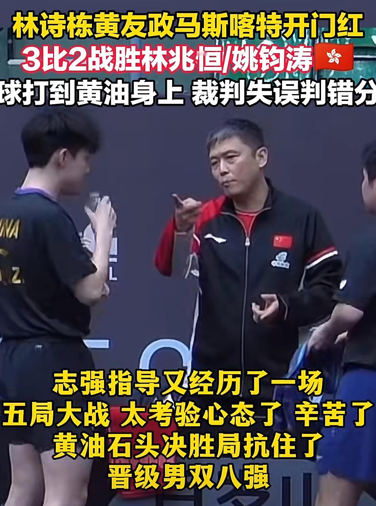 你一局,我一局, 一起干到决胜局! 林诗栋与黄友政对阵港队的林兆恒与姚钧涛, 场外是刘志强, 他的头发又要白几根, 前四局比分为11:5、3:11、 11:7、8:11, 又干到决胜局了。 决胜局双方咬的很紧, 又看到林诗栋的“不讲理”的反手, 加上他的台内摆短, 算球也厉害, 在7:5之后, 连得3分, 以10:5拿到5个赛点, 在对手追回一分后, 黄友政一个长摆, 以11:6终结比赛获胜, 恭喜林诗栋与黄友政男双晋级八强! 赛后的志强指导冲着他们两个人就开始“炒菜”, 还好他的心脏强大, 这些“臭”小子没一个省心的, 只要他做场外, 就是打满五局, 志强指导的下一岗是做薛飞的场外, 薛飞将对阵达科, 不会又是五局吧? 志强的命也是命呀, 这些“臭”小子就少折磨一点志强吧! 今天下半场的比赛, 已经取得三场胜利, 石洵瑶与王晓彤3:2战胜新加坡女双, 晋级女双八强, 林诗栋与黄友政战胜港队男双, 晋级男双八强, 陈垣宇3:0战胜新加坡选手冯耀恩 晋级男单16强。 恭喜!