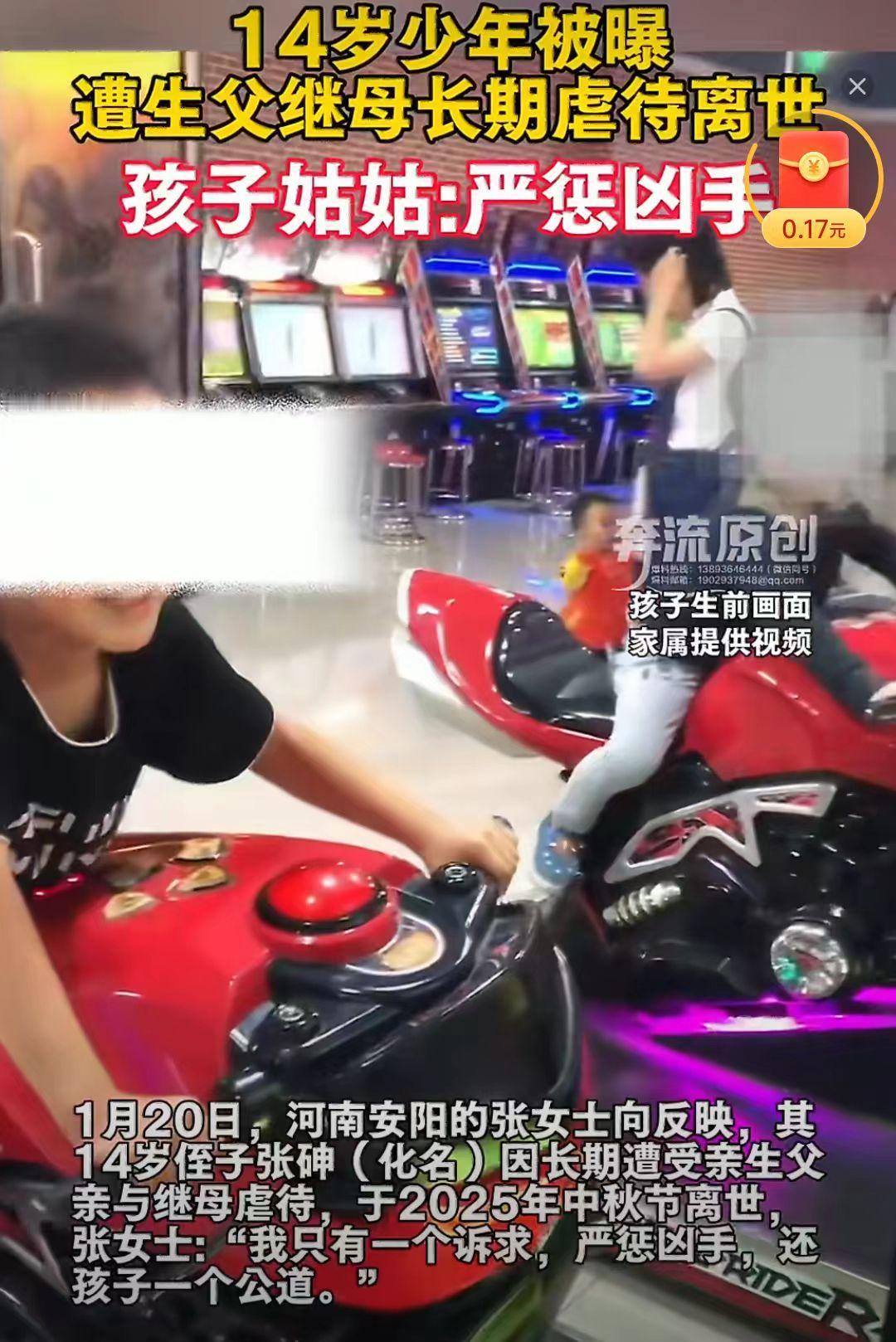 河南安阳一个14岁的孩子长期遭受生父和继母虐待离世,孩子死亡时还穿着尿不湿。几个月大时,妈妈就抛下他,偷偷的跑了,再也没出现过。 爸爸对孩子漠不关心,奶奶和姑姑见孩子可怜,便担起了照顾他的责任。 孩子9岁时,孩子的爸爸谈了对象结婚了,就把孩子从姑姑家接回去了。 没想到,这将是孩子的噩梦的开始。 几个月后,孩子的姑姑发现孩子身上有很多淤青,像是被人打的。 孩子姑姑心疼了,便和弟弟(孩子爸爸)商量想把孩子接到自己身边养着,孩子爸爸不同意。 结果,在2025年中秋节时,孩子死了,年仅14岁。 警方出具的尸检报告显示,这孩子死亡时身高仅1.4米,身体存在肝坏死、肺出血、脑出血等多处损伤,身体机能已达到败血症状态,死亡时还穿着尿不湿。 孩子姑姑说:“尸检说这是长期虐待、不给饭吃导致的。” 一个14岁的孩子,是怎么狠心不给孩子饭吃的。老话说好,虎毒不食子呢? 孩子去世前,还向继母哭求“给我一杯水喝喝……”。 2025年10月,当地警方以涉嫌故意伤害立案,其生父已被刑事拘留。 孩子的生父被抓后却说:“自己只是在管教孩子时,不小心把孩子打死了。” 相信正义可能会迟到,但永远不会缺席。孩子去世 太可怜的小孩 男童的死 14岁男孩之死