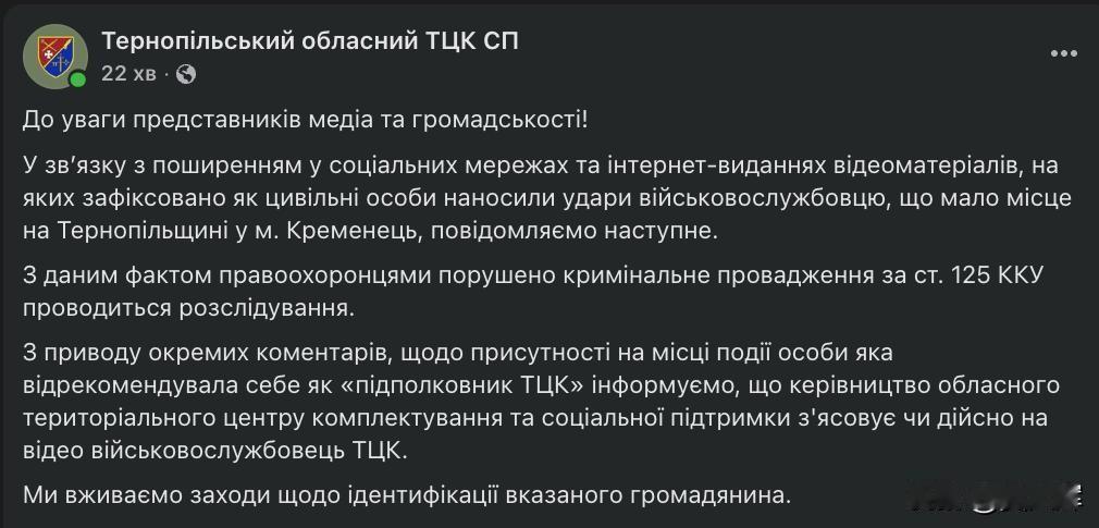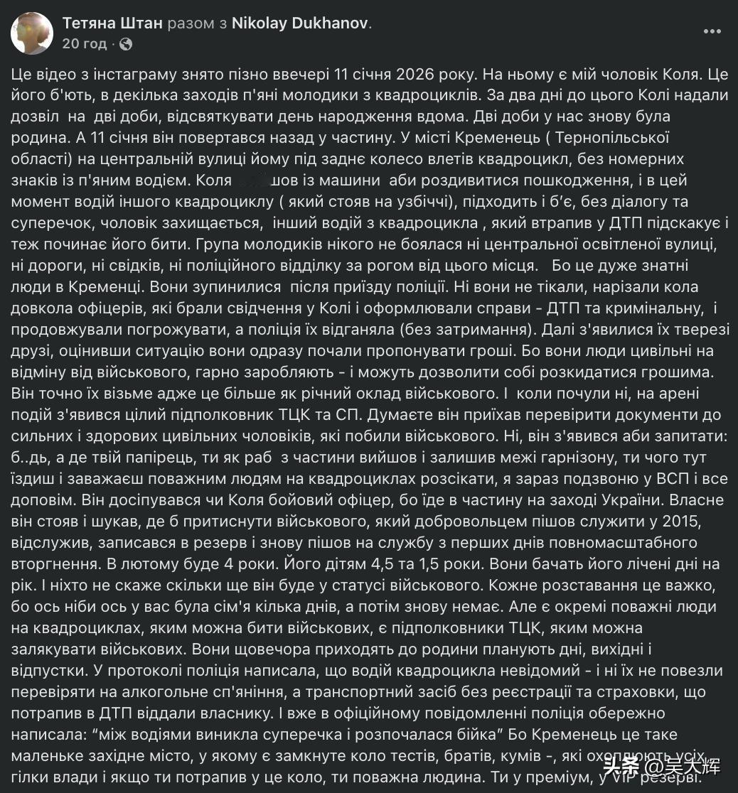 【乌克兰地方征兵办的权力】 乌克兰特尔诺波尔州克雷梅涅茨市发生一起恶性殴打乌克兰军人事件。一伙醉酒的纨绔子弟驾驶四轮摩托,殴打了一名军人。据受害军人的妻子称,警方与地方征兵办公室实则在包庇肇事者。 据乌克兰“1+1新闻”记者塔季扬娜·施坦讲述,她的丈夫、军人尼古拉·杜哈诺夫于1月11日短暂休假后返回部队途中,一辆无牌照四轮摩托撞上了他的汽车。当他下车检查车辆受损情况时,遭到数名醉酒青年的围殴。 她表示,警方在调查过程中主要盘问受害军人,而肇事团伙却能在现场附近随意游荡,全程未被拘留。肇事者的熟人曾试图用钱私了此事,但遭到军人拒绝。此后,一名自称征兵办公室少校的男子抵达现场。受害人妻子称,此人非但没有就袭击事件作出处置,反而百般刁难受害军人,不断盘问他是否有权擅自离开部队驻地。 最终警方出具的笔录中写明,四轮摩托驾驶人身份不明,且这辆无牌照、无保险的涉事车辆已被交还车主。 特尔诺波尔州征兵办公室回应称,已就这起殴打事件以“轻度人身伤害”罪名立案侦查,相关调查正在进行中。同时该部门表示,正在核实这名自称少校的男子是否确为征兵办公室工作人员,并对其身份展开核查。
