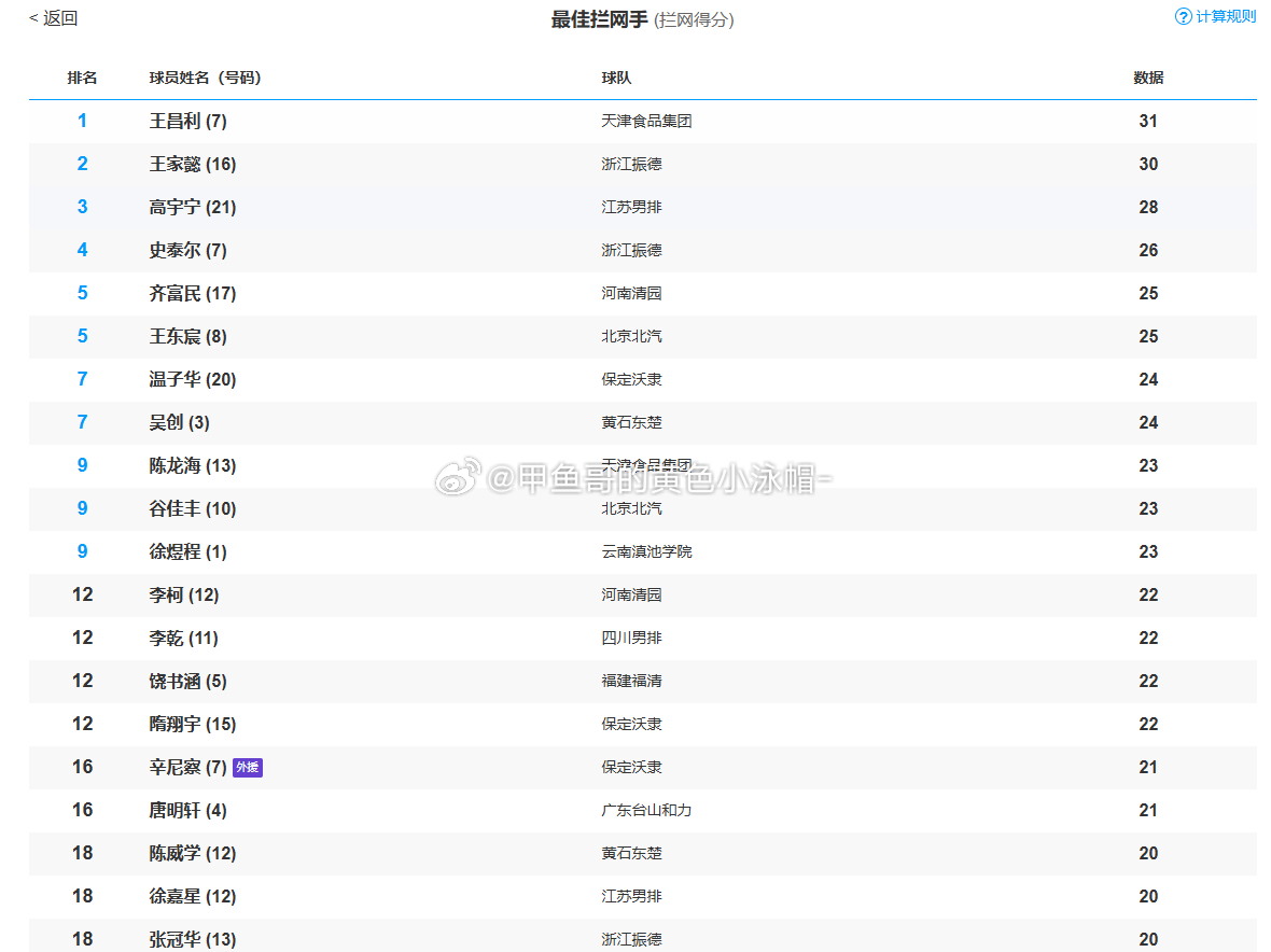 2025-2026中国男排超级联赛 男排联赛截止今天拦网得分榜排名:1.王昌利31分2.王家懿30分3.高宇宁28分4.史泰尔26分5.齐富民25分5.王东宸25分7.温子华24分7.吴创24分9.陈龙海23分9.谷佳丰23分9.徐煜程23分