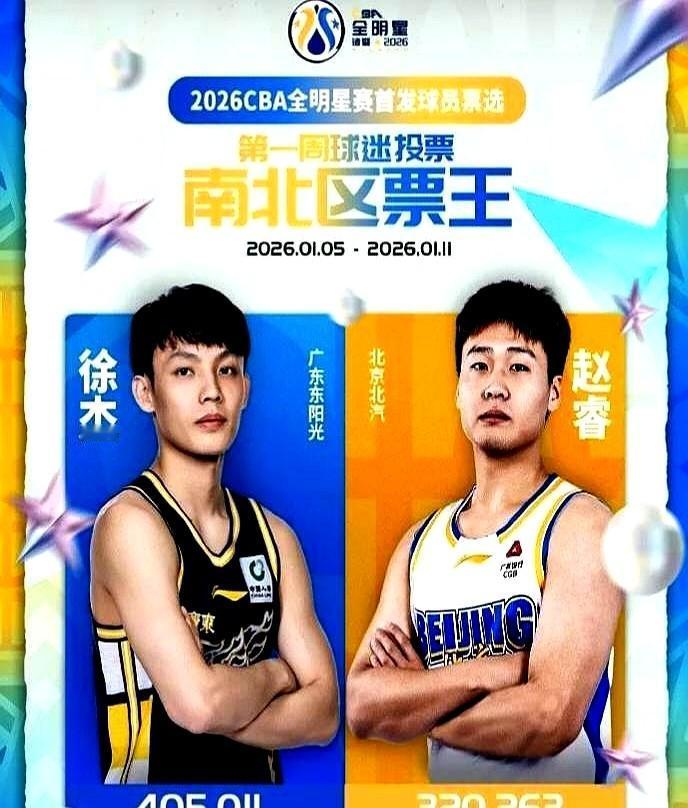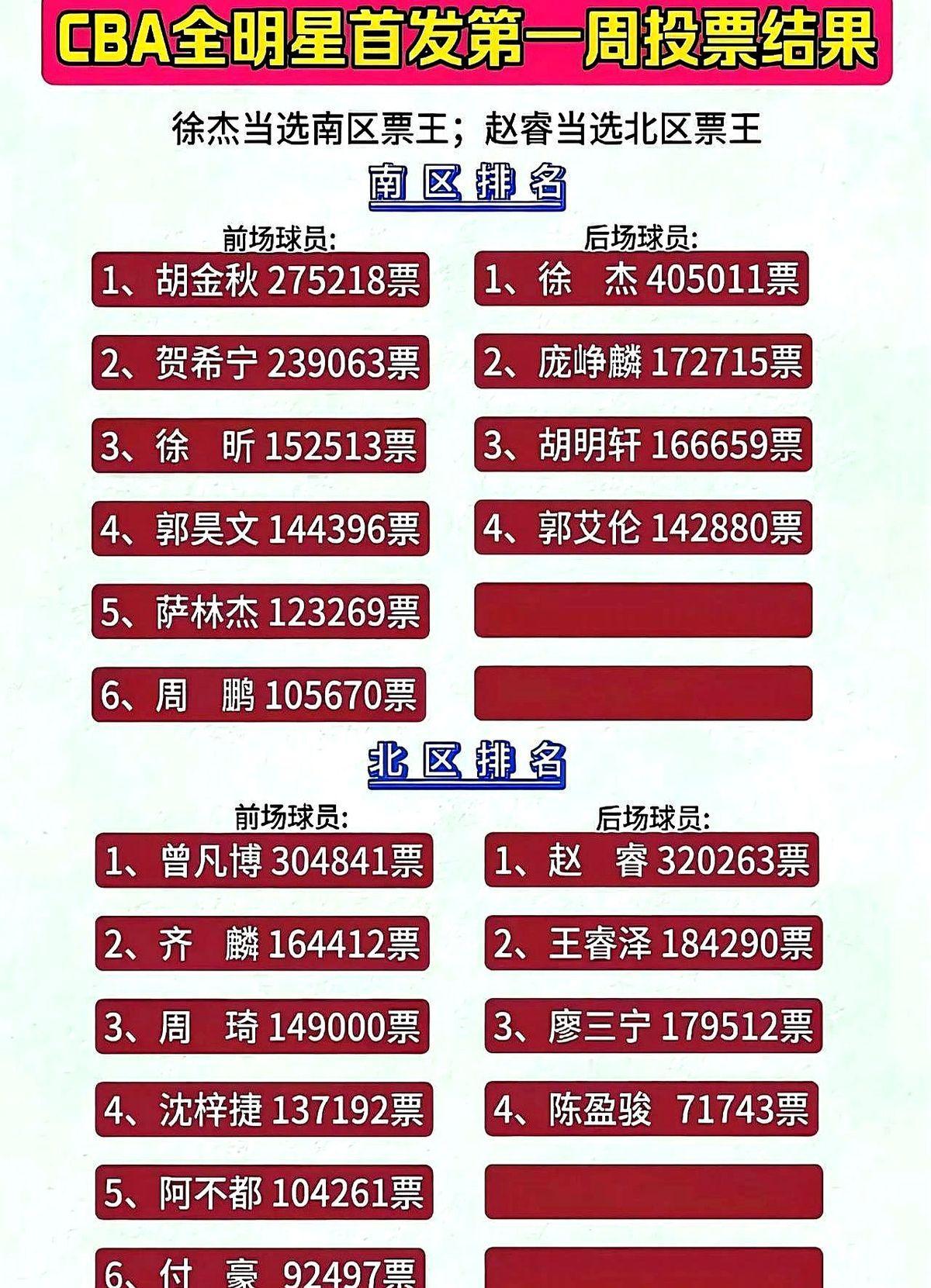 CBA全明星投票简直太疯狂了!胡明轩、郭艾伦竟然一度被甩在后面? 南区后场彻底乱套了……广东队的徐杰一个人就卷走77万多票,直接断层领先,总票王稳了。 最刺激的是第二名的争夺!第一周,新秀黑马庞峥麟直接冲上来,把胡明轩都给挤下去了。 结果第二周,胡明轩的粉丝硬是砸出32万票,惊险反超!现在他俩就差几千票,随时可能换位。 另一边,只打了2场的郭艾伦也快30万票了,这人气真的没话说。 北区的赵睿更是几乎没怎么打,直接“躺赢”当上票王。 全明星嘛,本来就是看个热闹。这最终的首发阵容,你猜会是谁?