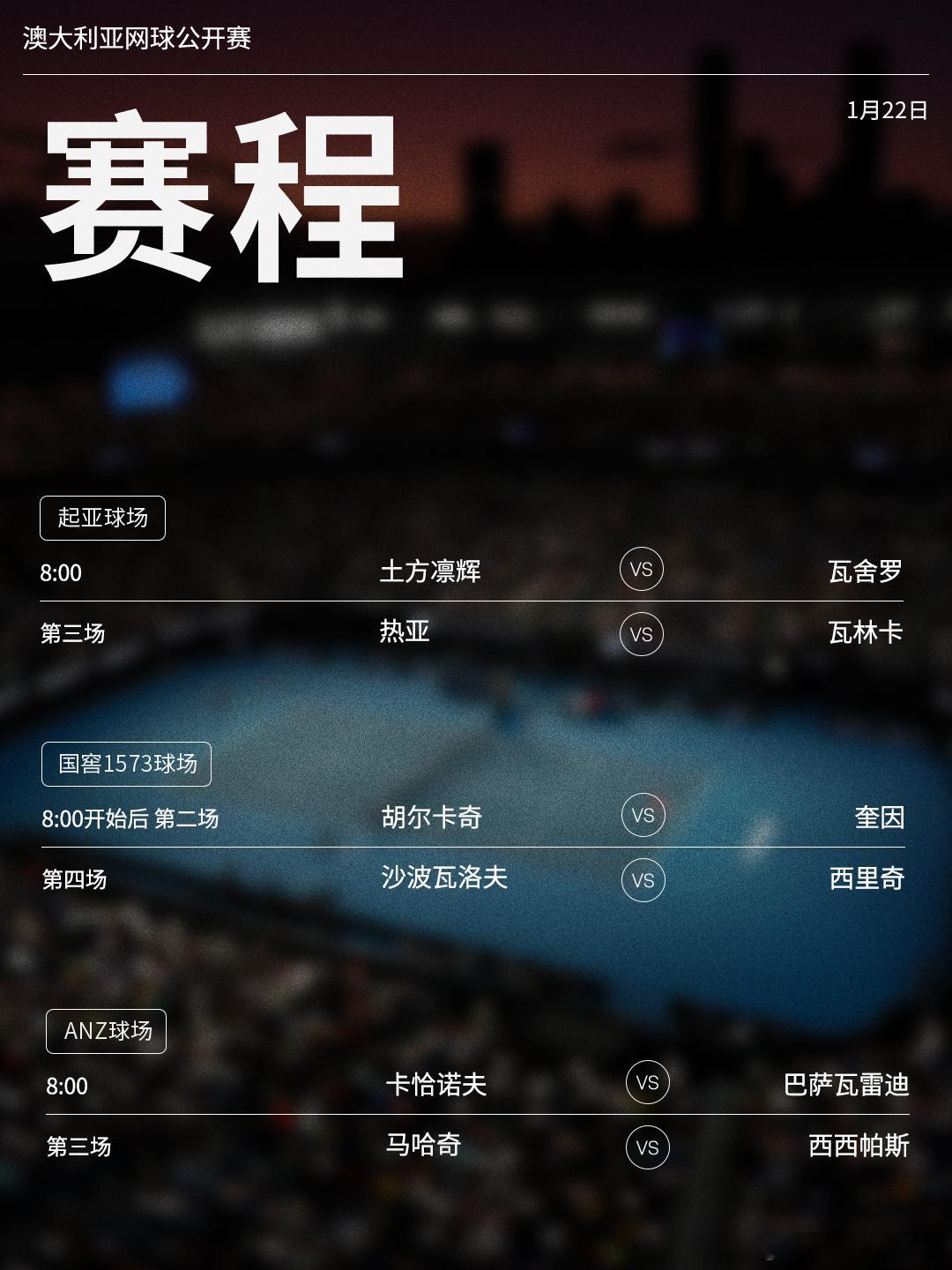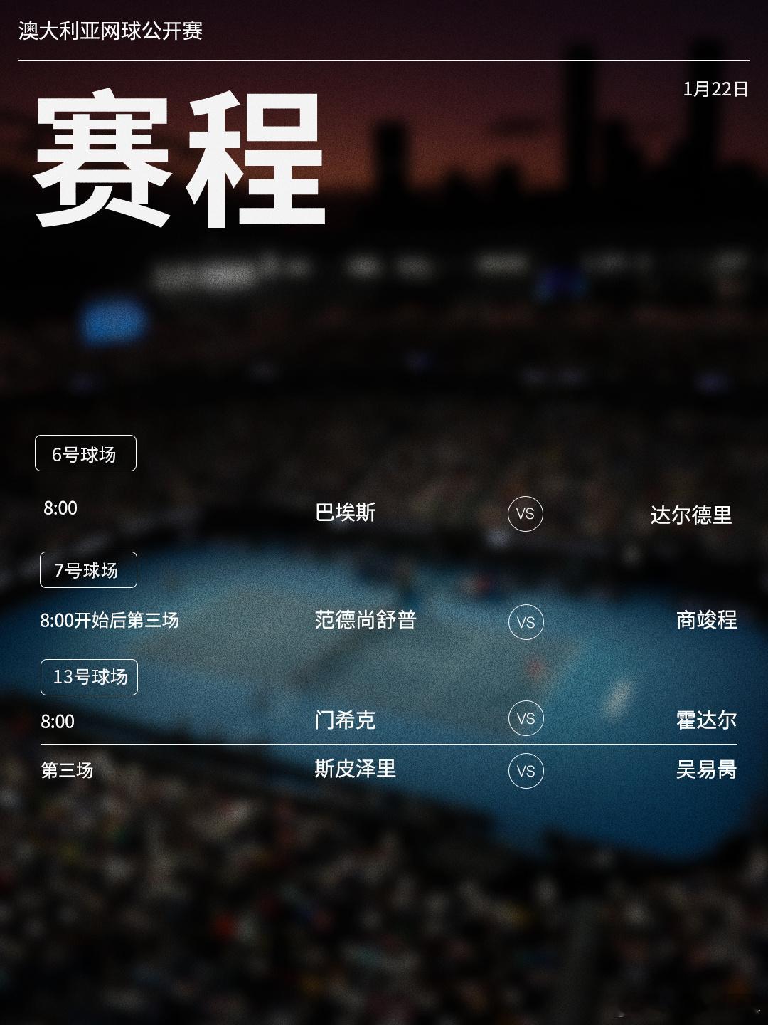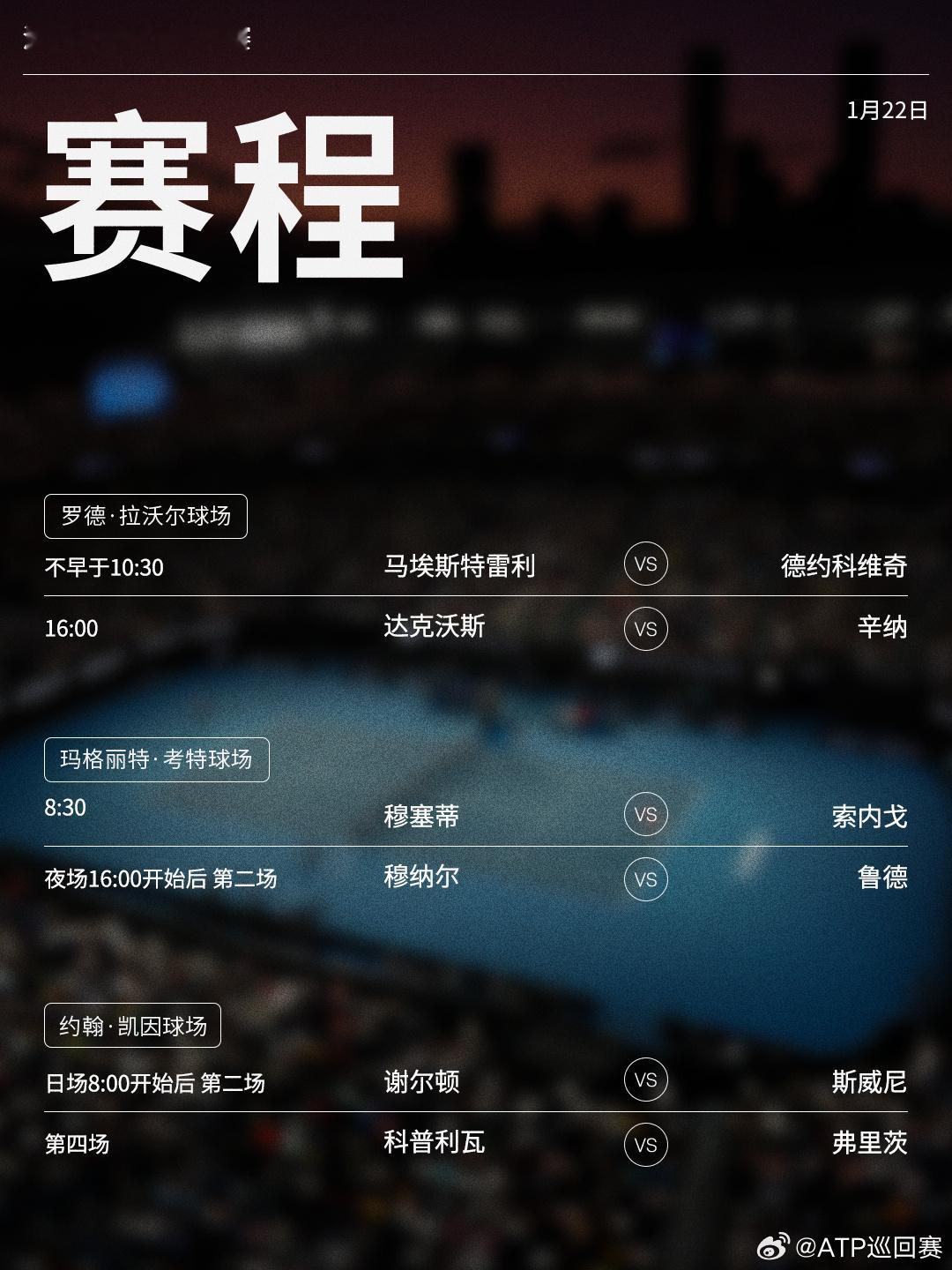 澳网2026 1月22日将展开下半区男单二轮的争夺,赛程见图(均为北京时间)📅🎾 商竣程、吴易昺将向32强发起冲击,卫冕冠军辛纳、十冠王德约科维奇、前赛会冠军瓦林卡、谢尔顿等球员均出战。网来不息ATP